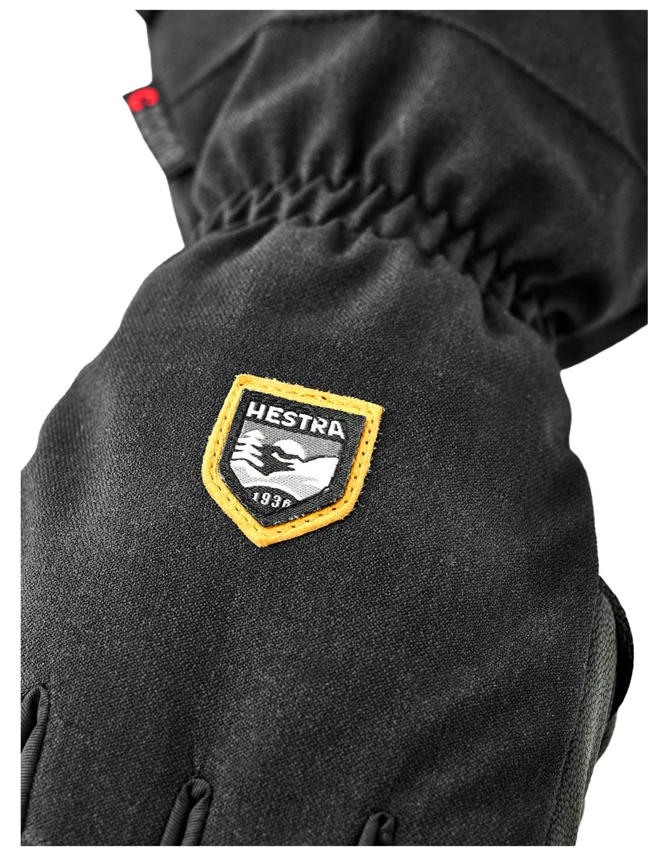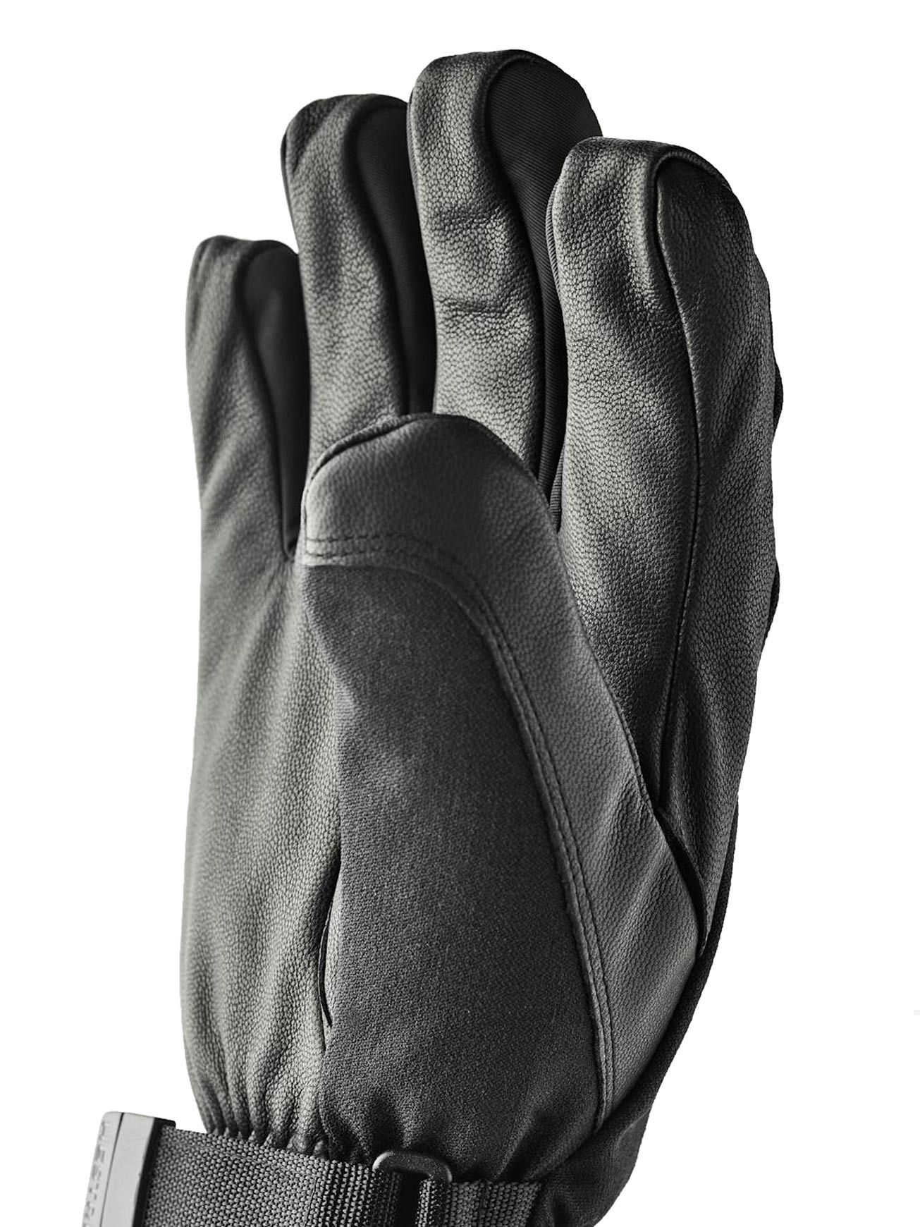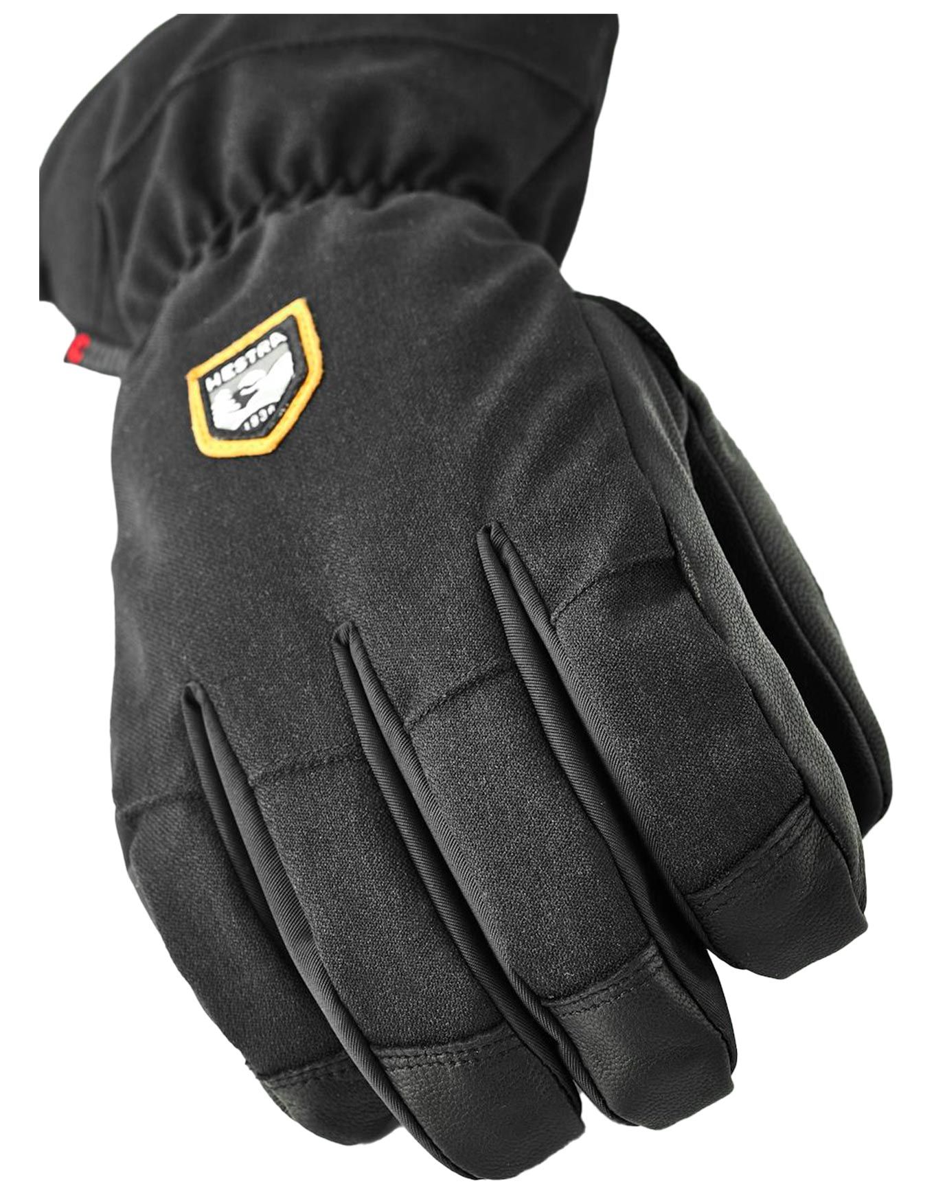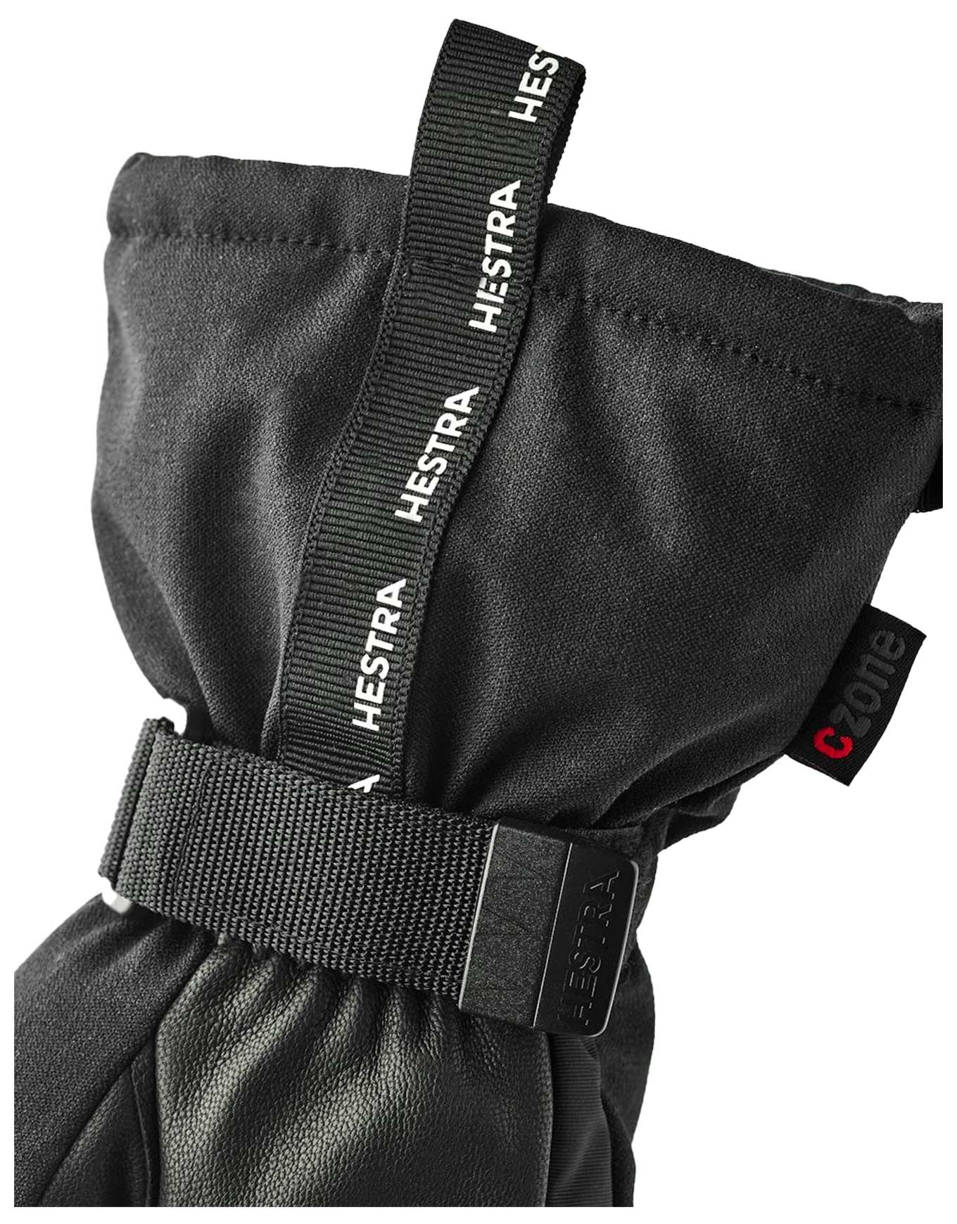 Gants de ski Hestra CZone Mountain Black, chauds et imperméables, membrane respirante, paume en peau de chèvre, isolation Fiberfill, ajustement velcro et dragonne incluse.