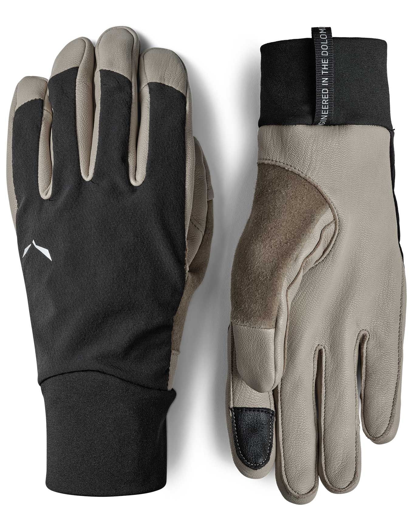 Gants Salewa Ortles DST Black Out softshell légers, paume cuir de chèvre, doigts préformés, isolation brossée, coupe-vent respirant pour alpinisme, cascade de glace et ski de randonnée.