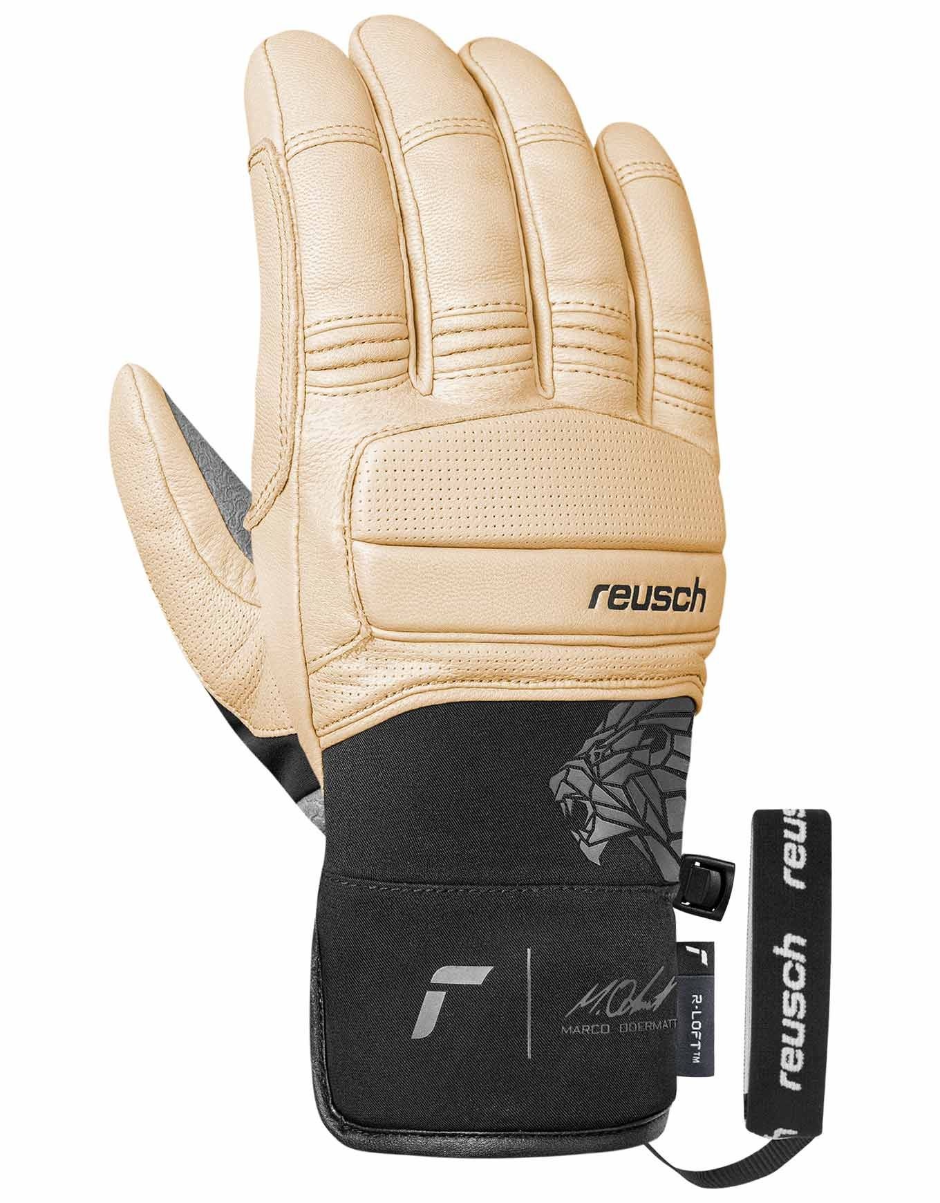 Gants de ski Reusch Marco Odermatt Tan/Black unisexe, co-créés avec le champion : cuir de chèvre, softshell dorsal, isolation R-LOFT™ et renforts protégeant pour grip, chaleur et confort fiables sur piste.