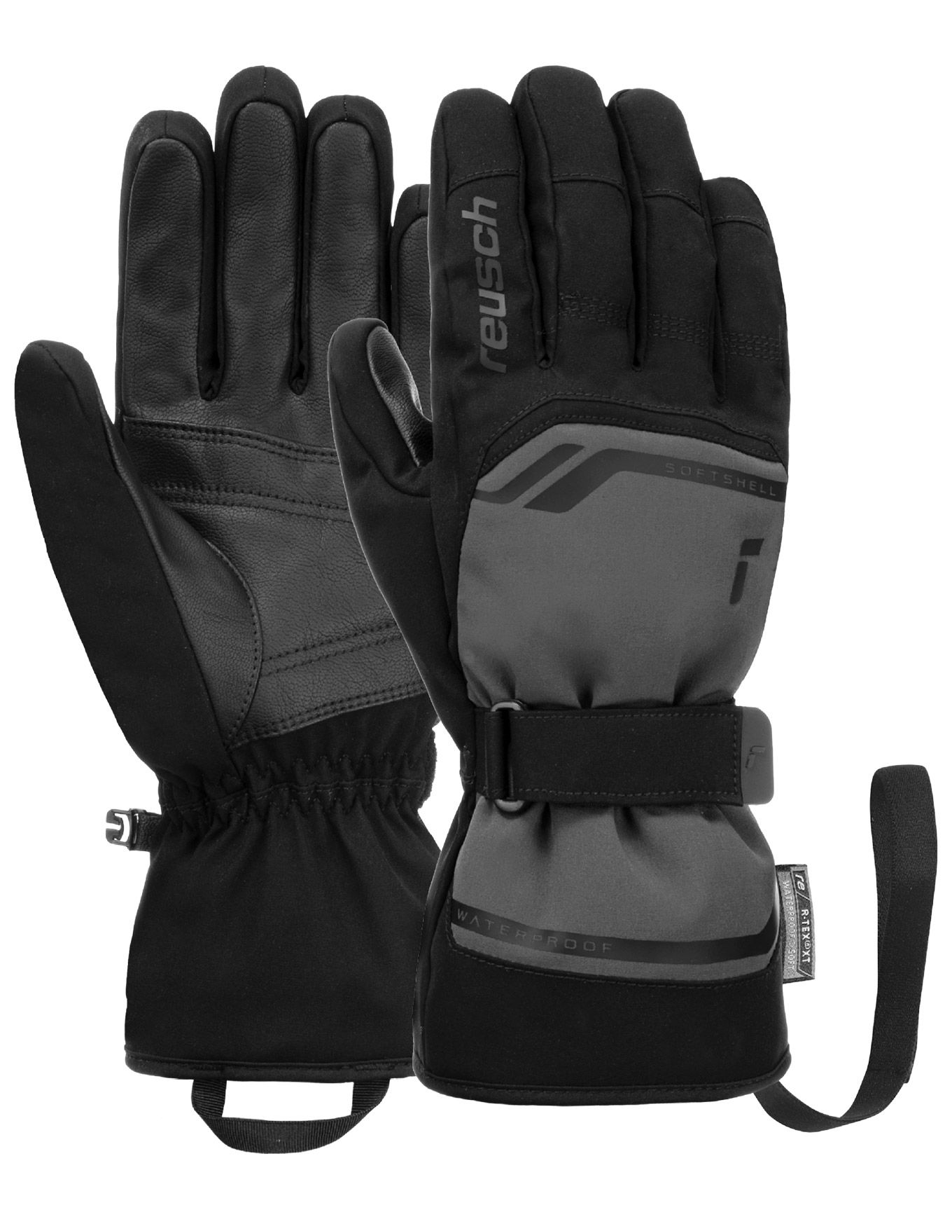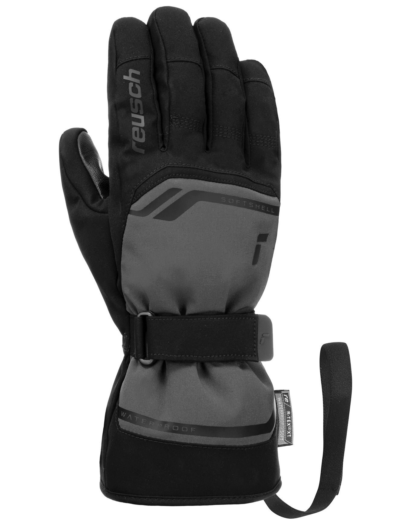 Gant Reusch Primus R-TEX® XT Frost Grey/Black en softshell imperméable et respirant, isolation R-LOFT™ chaude et légère, paume adhérente, poignet ajustable et leash intégré, pour ski et snowboard.