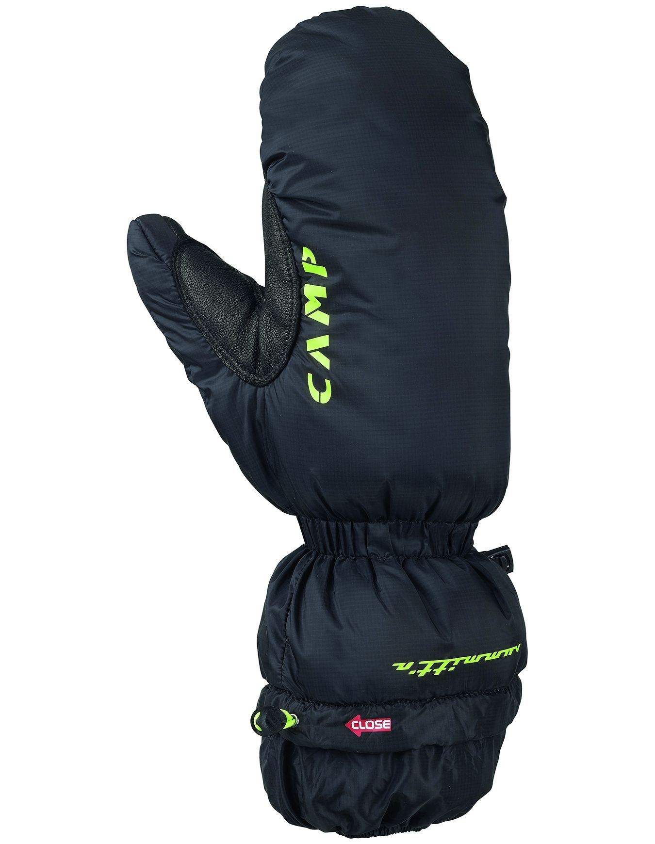 Moufle Camp Summitt’N Black, imperméable et respirante grâce à la membrane Dryzone, isolée en Primaloft® Gold, paume en cuir de chèvre pour flexibilité et adhérence.