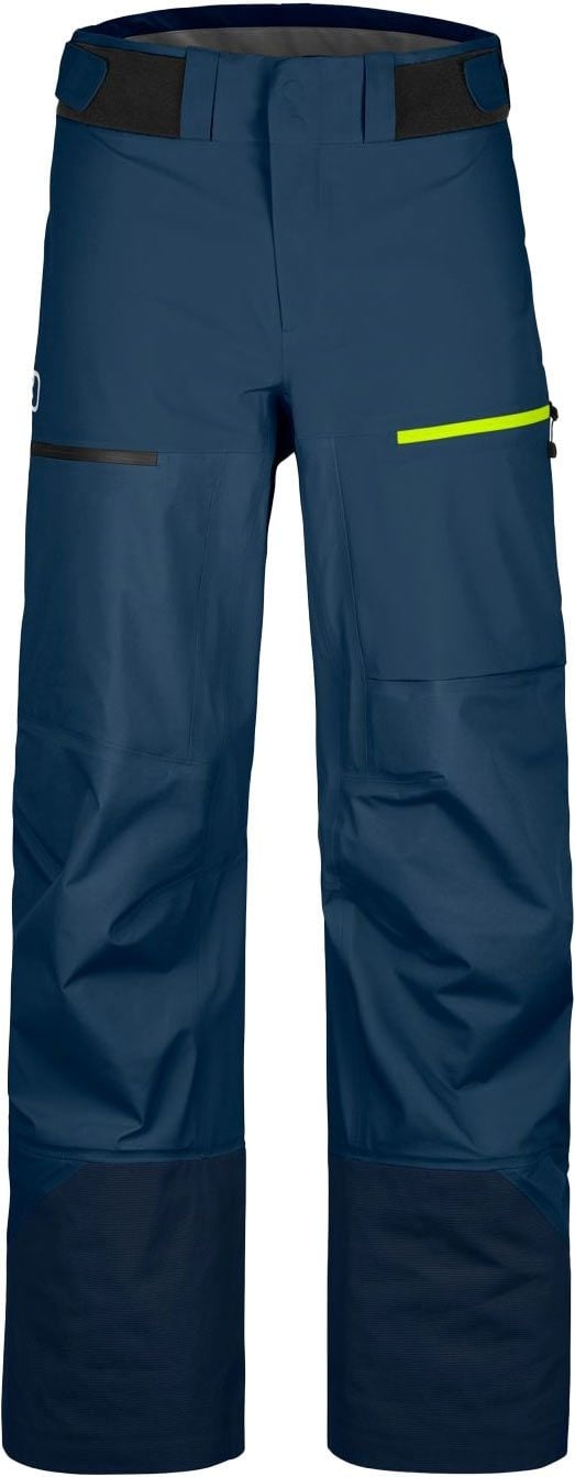 Pantalon technique freeride Ortovox 3L Ravine Shell Pants Deep Ocean pour homme, membrane Dermizax® NX imper-respirante, doublure laine mérinos thermorégulante, ceinture réglable, ventilations, genoux préformés.