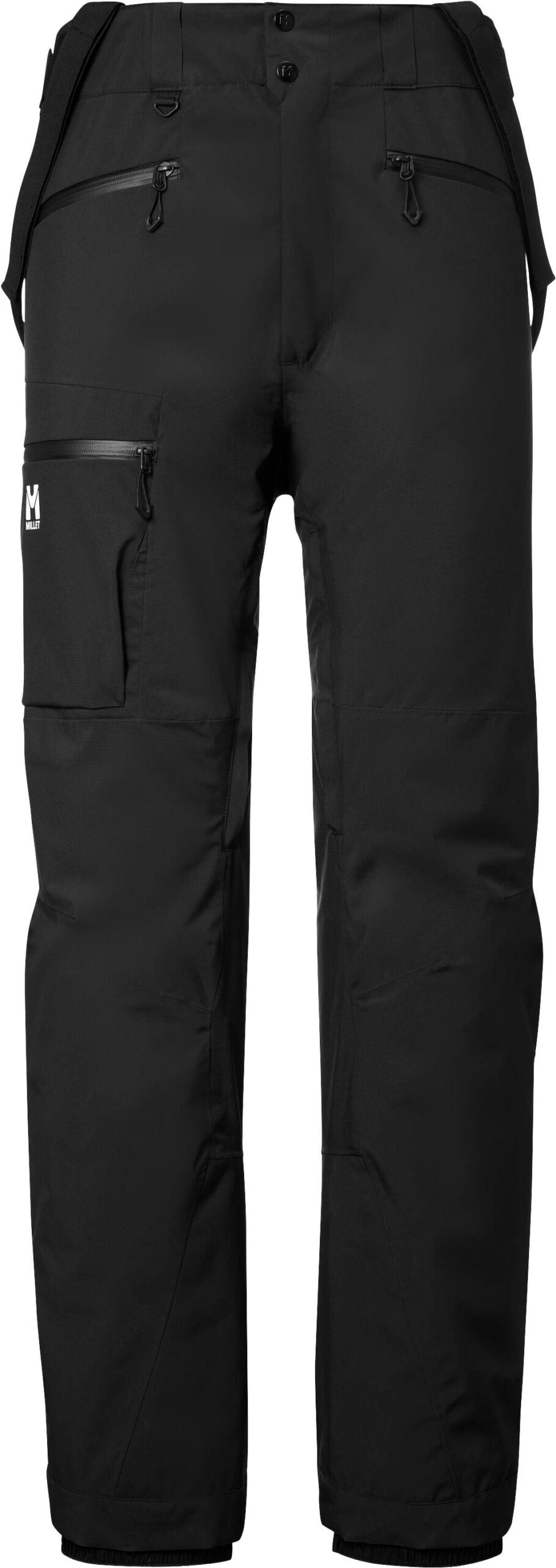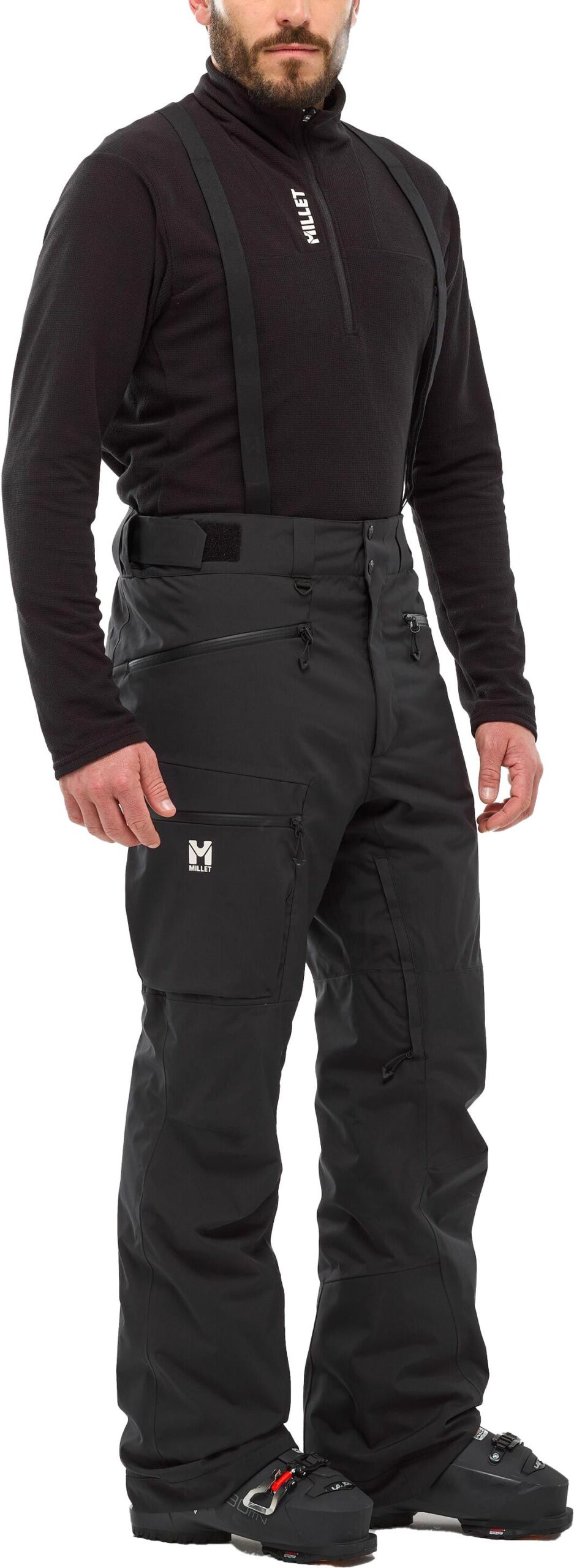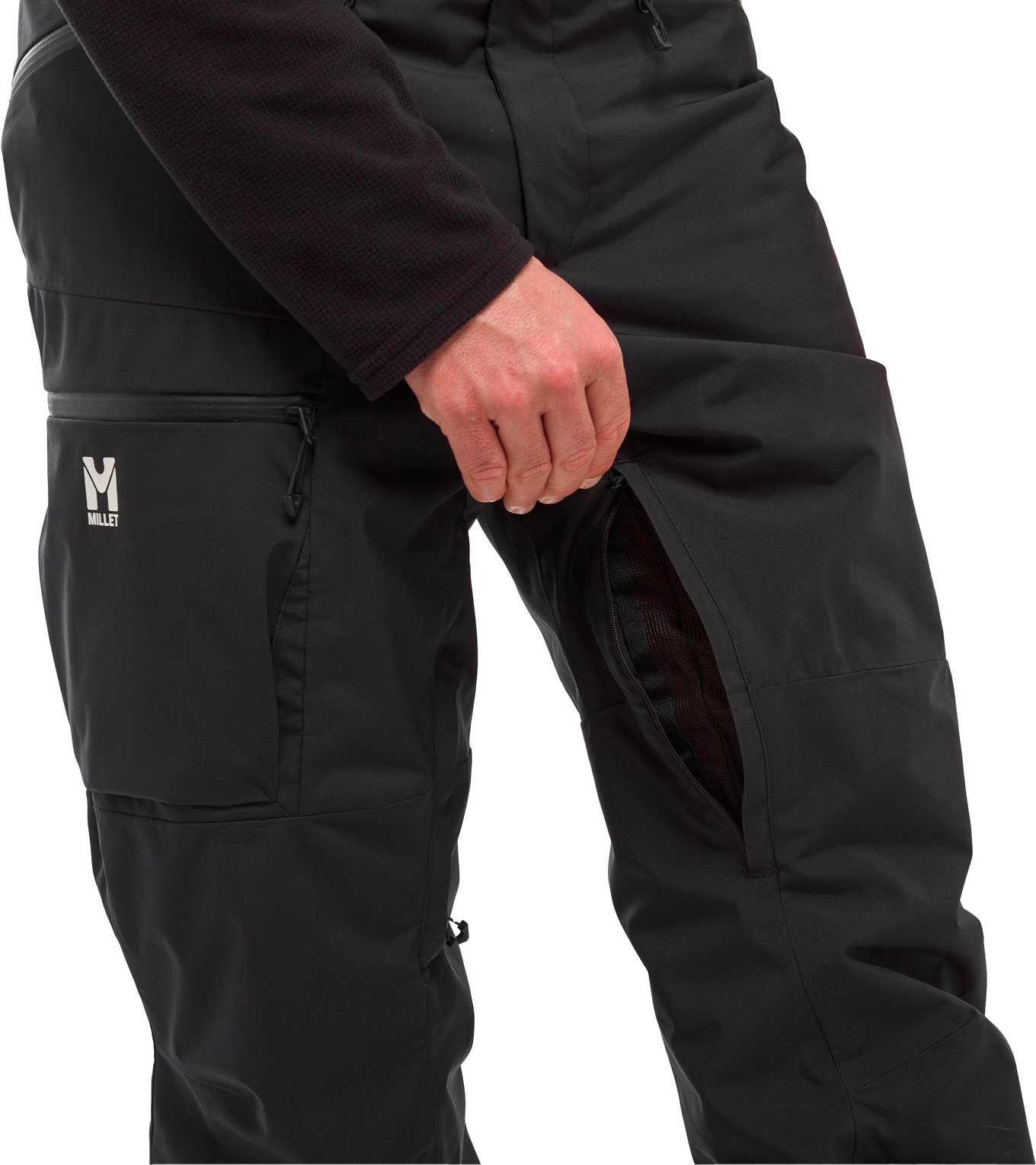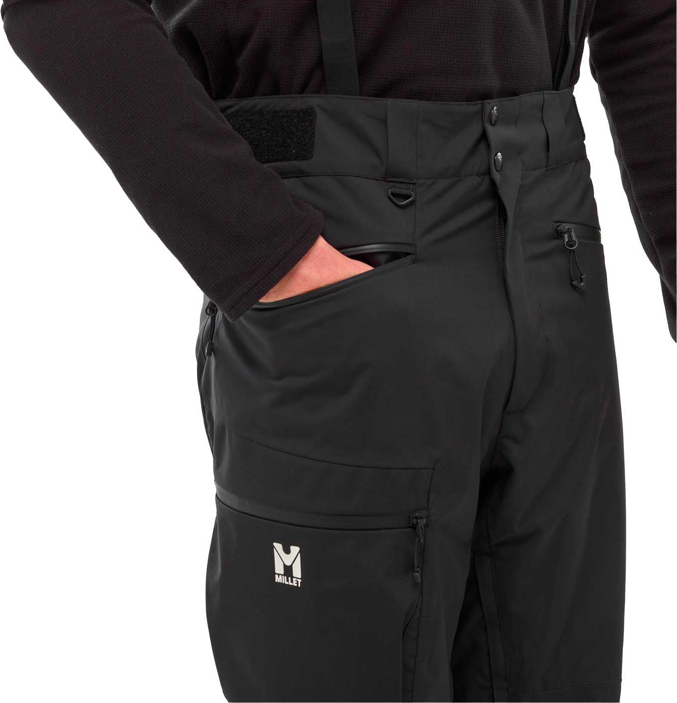 Pantalon Millet Grands Montets Black, coupe-homme ski alpin : membrane DRYEDGE™ stretch 20k/20k, coutures scellées, guêtres pare-neige, genoux préformés et aérations intérieures pour confort et protection maximale sur piste.