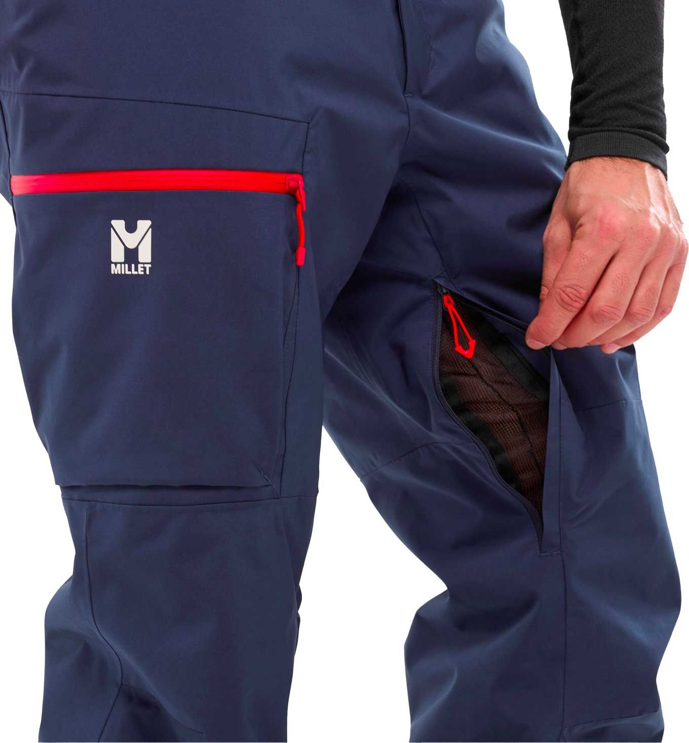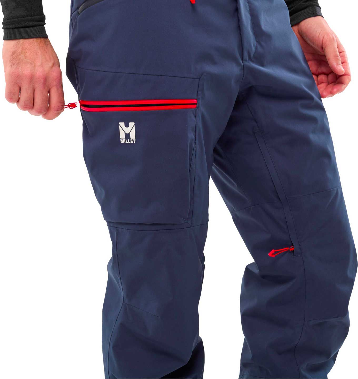 Pantalon de ski Millet Grands Montets Saphir homme en tissu stretch DRYEDGE™ 20 k/20 k, coutures scellées, guêtres pare-neige, genoux préformés, ventilations et poches étanches.
