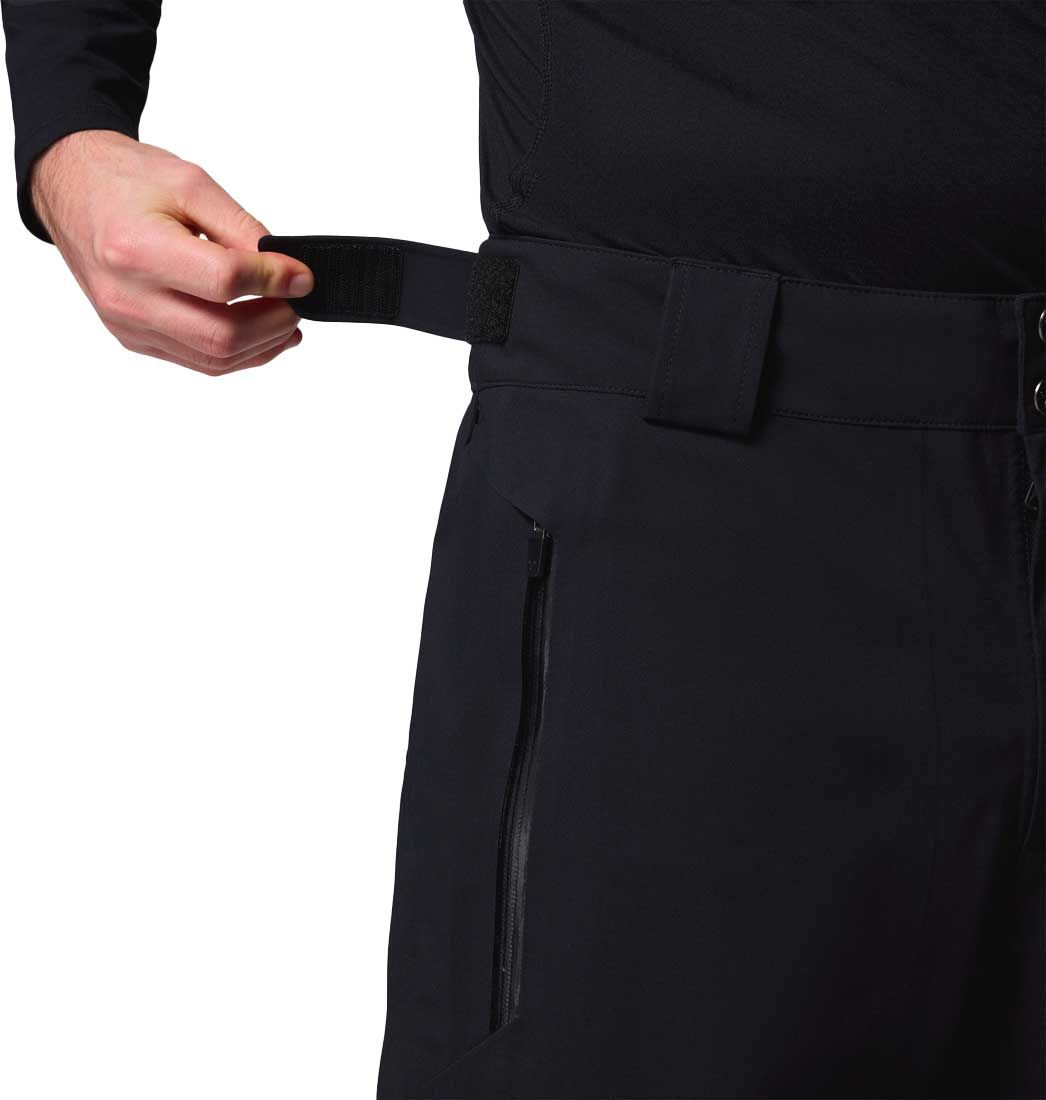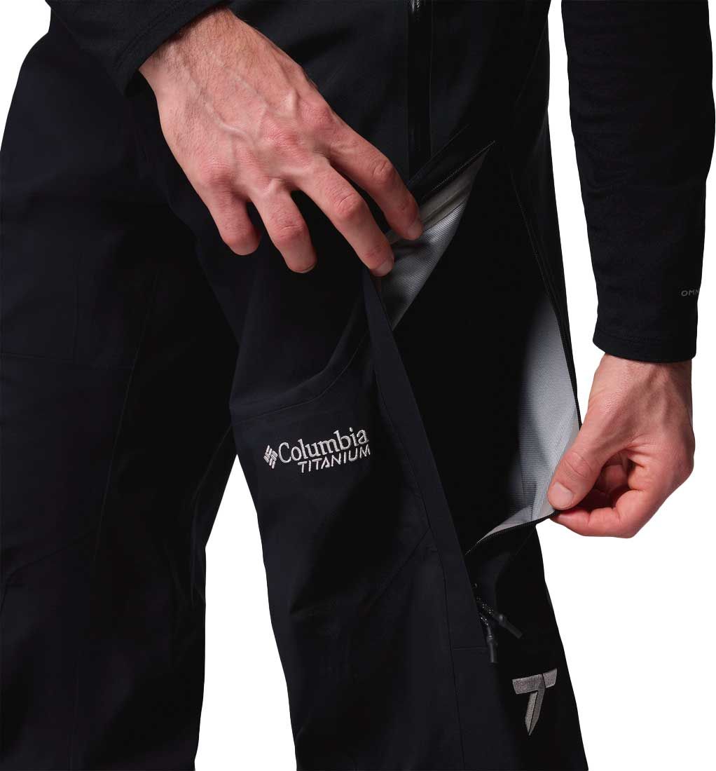 Tissu coupe-vent, imper-respirant et extensible. Coutures étanches, genoux cintrés, taille réglable. Poches latérales fermées par zip, renforts au bas des jambes, zips d’aération intérieurs et guêtres intégrées. Entrejambe : 81 cm.
