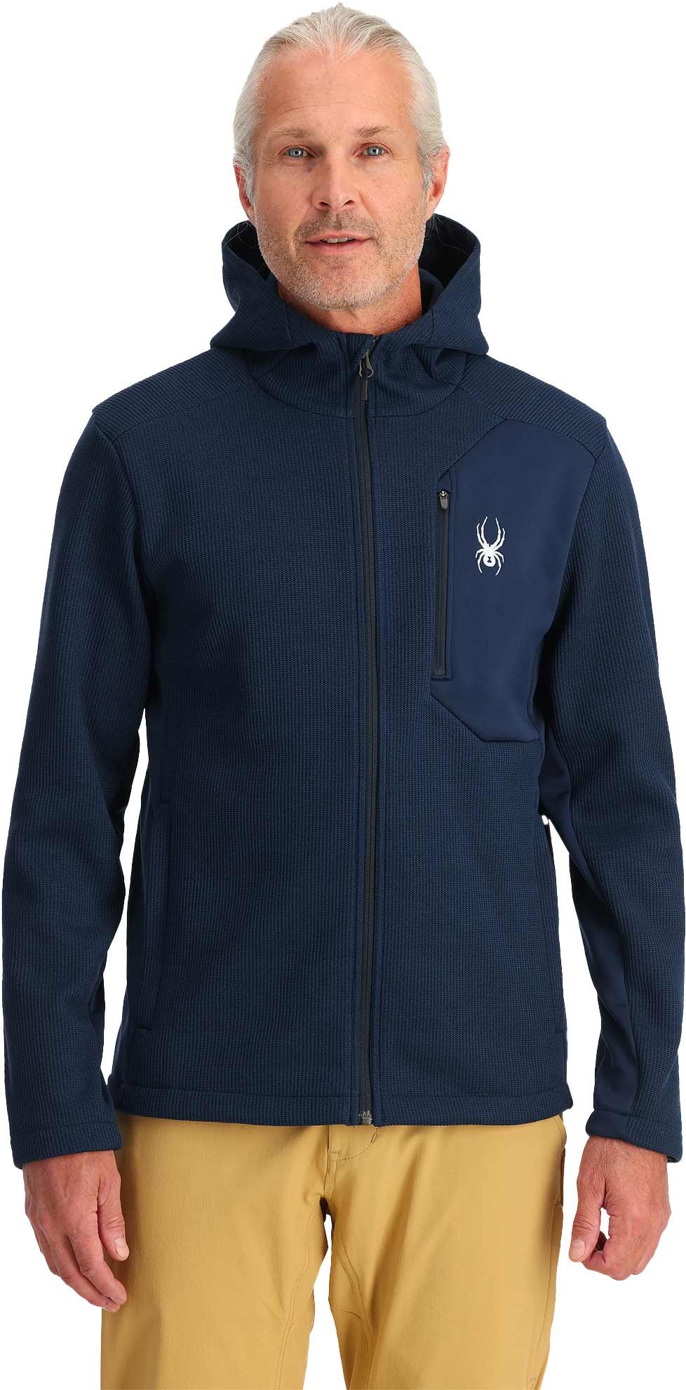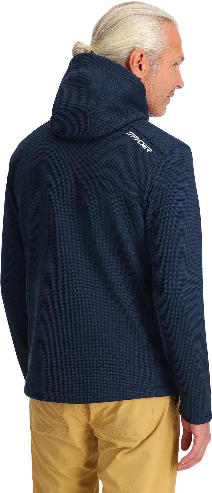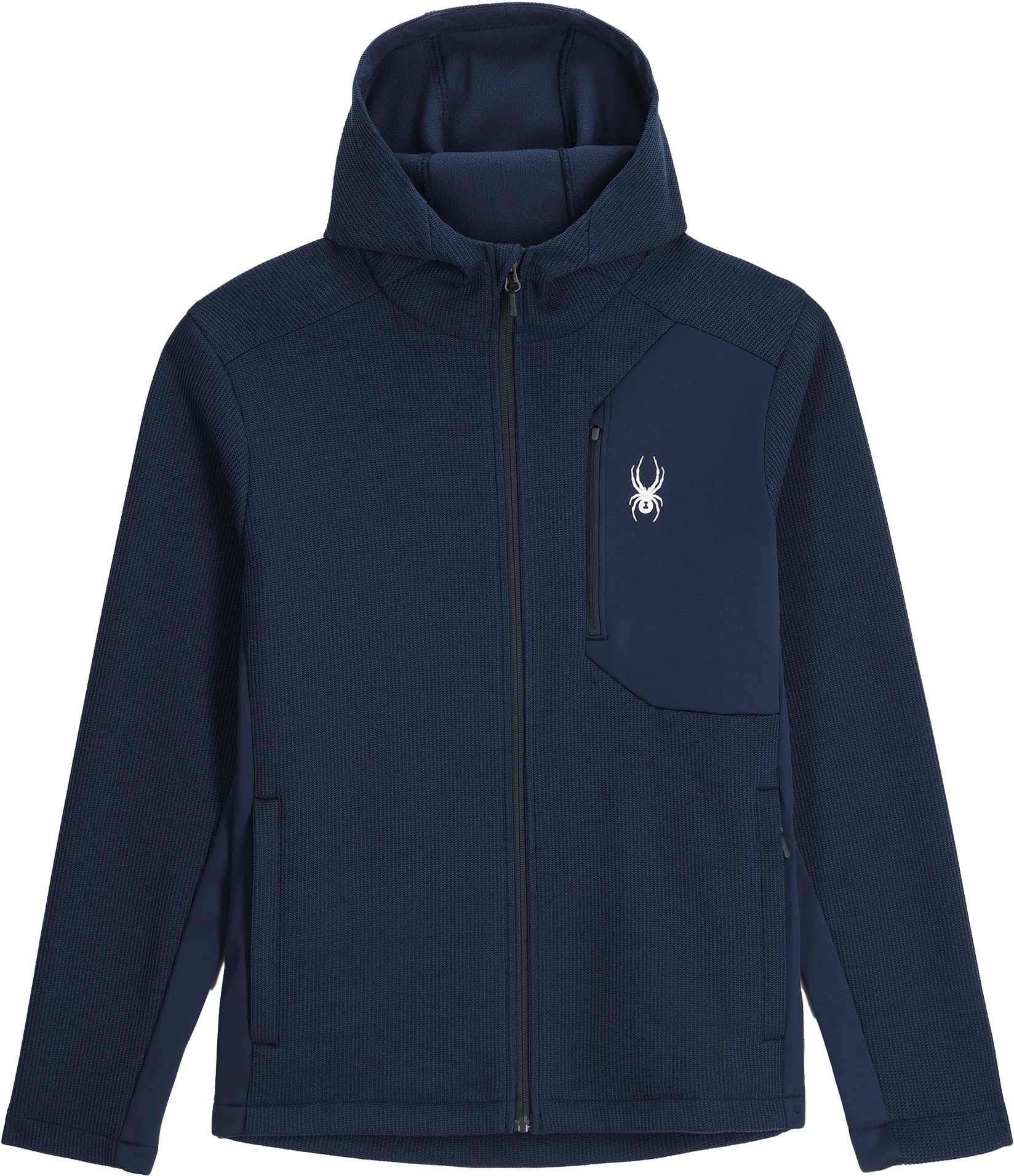Veste polaire Spyder Bandit Hooded True Navy pour homme, en polyester léger, régule la température et offre mobilité par molleton extensible aisselles et côtés, capuche microfibres, fermeture intégrale, poche poitrine et poches mains.
