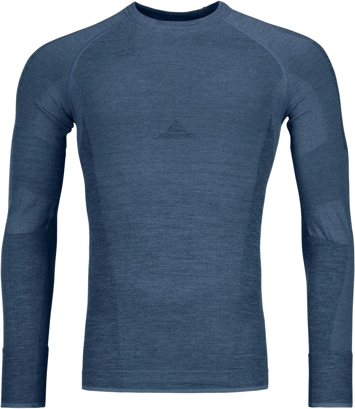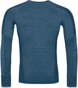 Le haut technique Ortovox 230 Competition Long Sleeve Petrol Blue homme combine laine mérinos respirante et body mapping sans couture pour thermorégulation optimale en ski de randonnée.