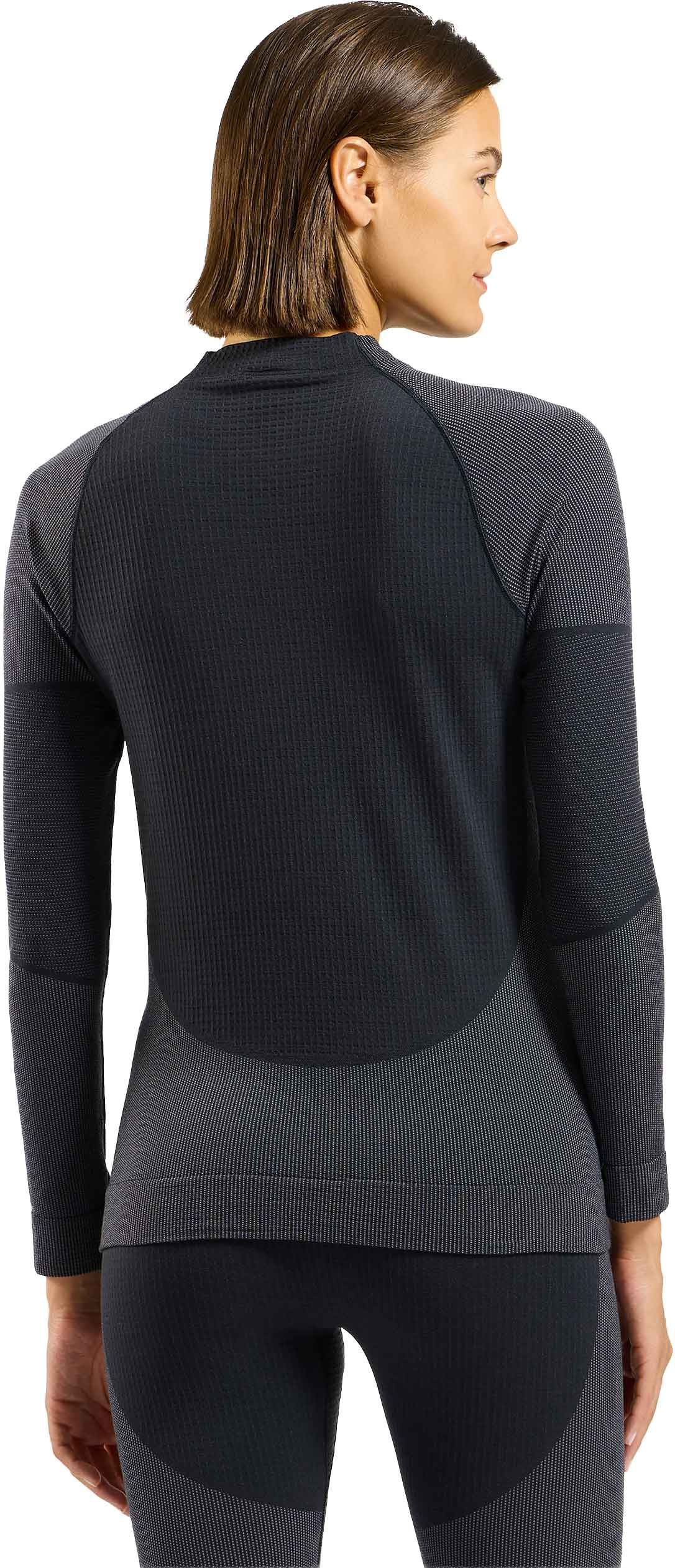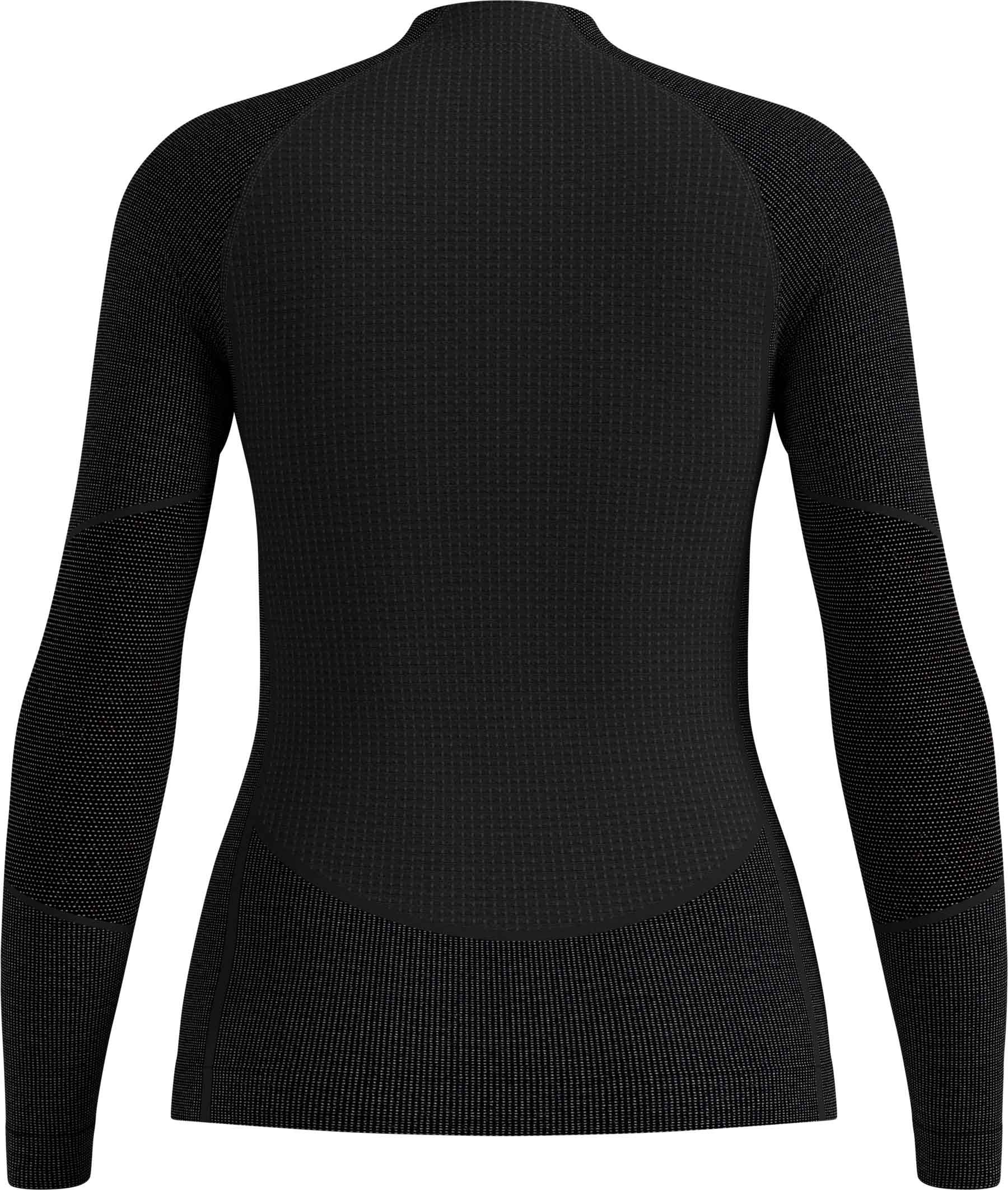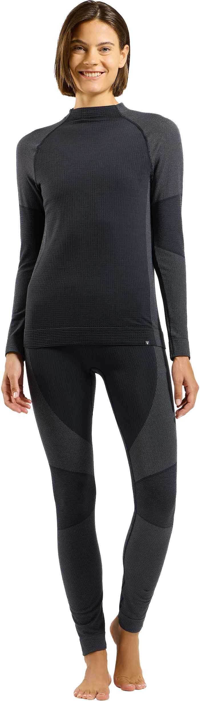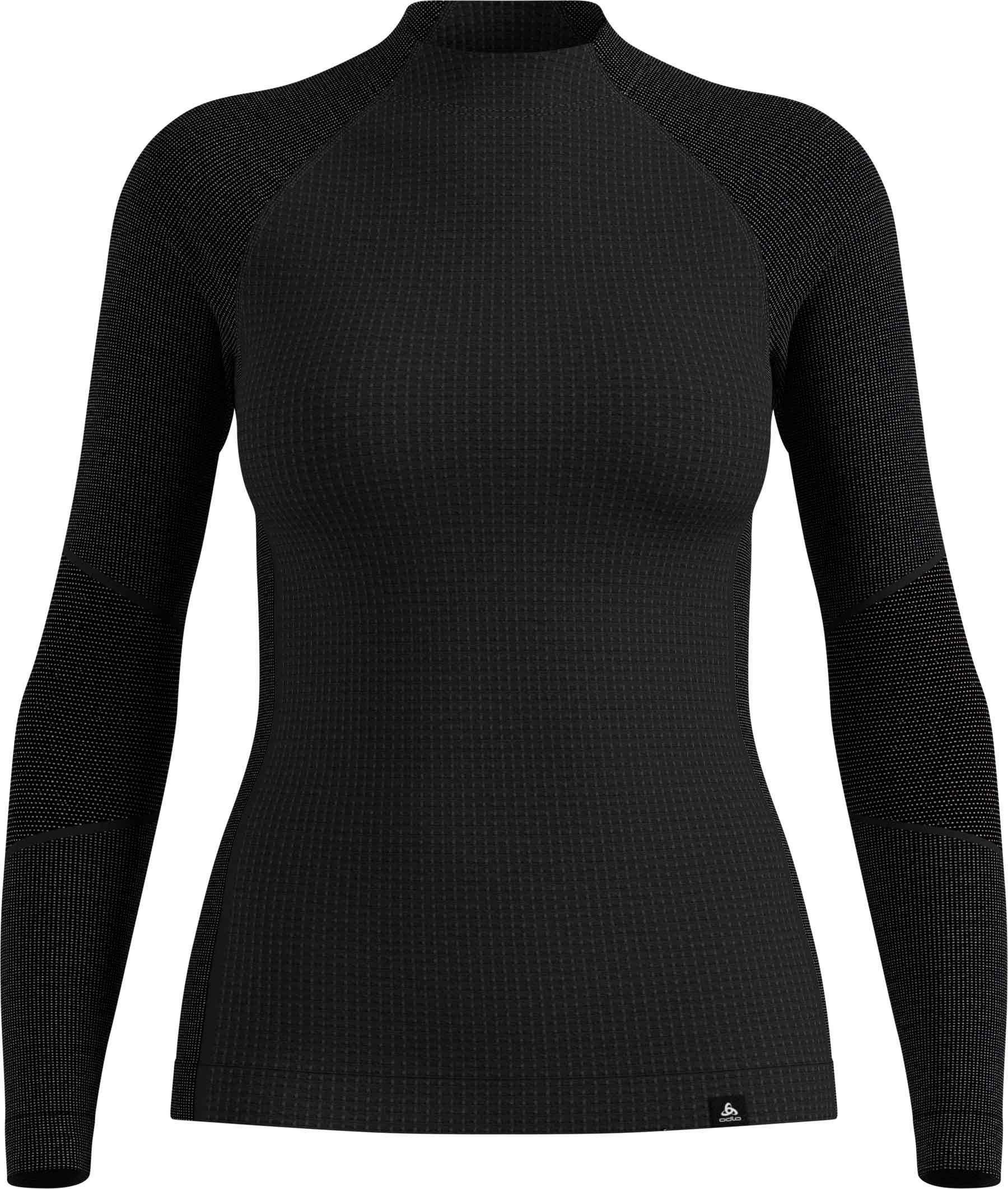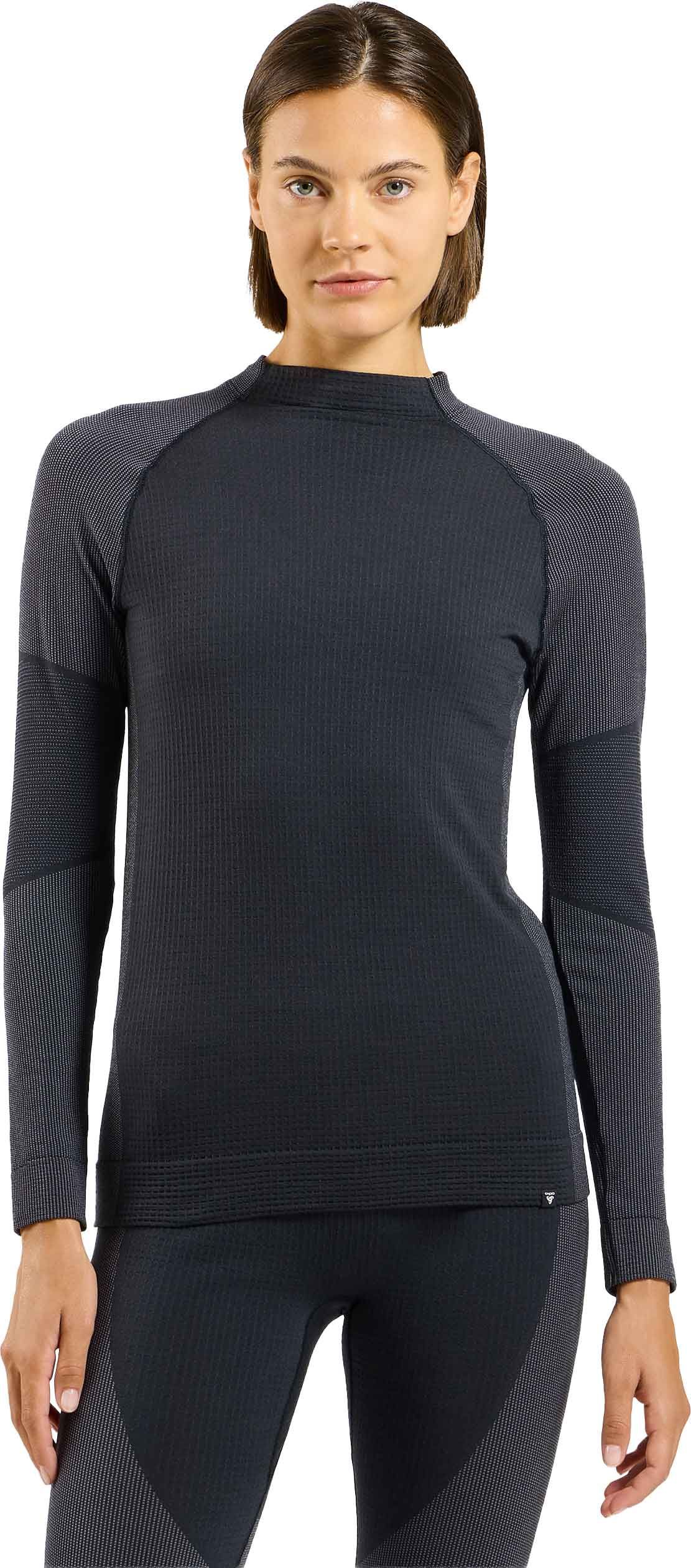 Haut thermique femme Odlo BL Top Crew Neck LS Seamless Performance Black en laine mérinos isolante, respirante et anti-odeurs, sans coutures pour un confort sans frottements pendant l’effort hivernal.