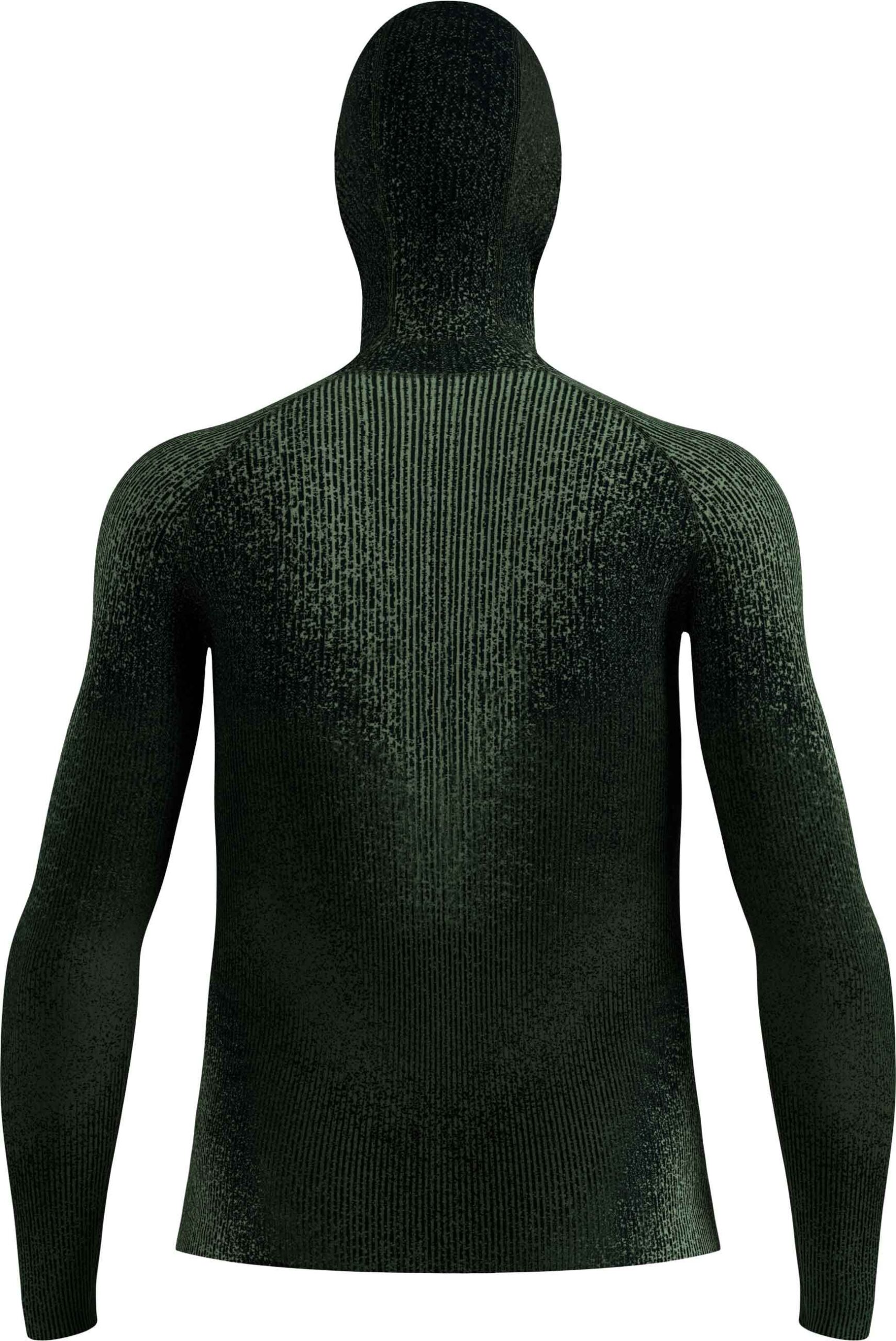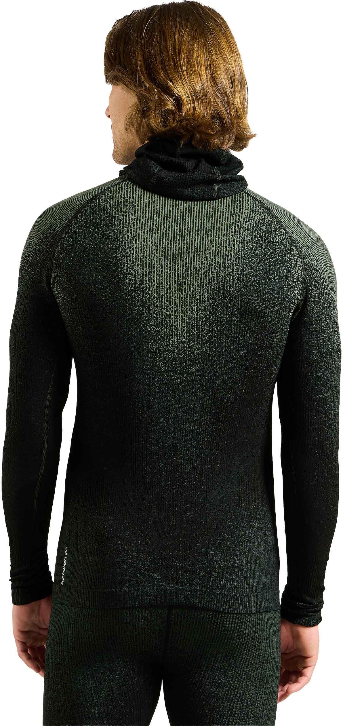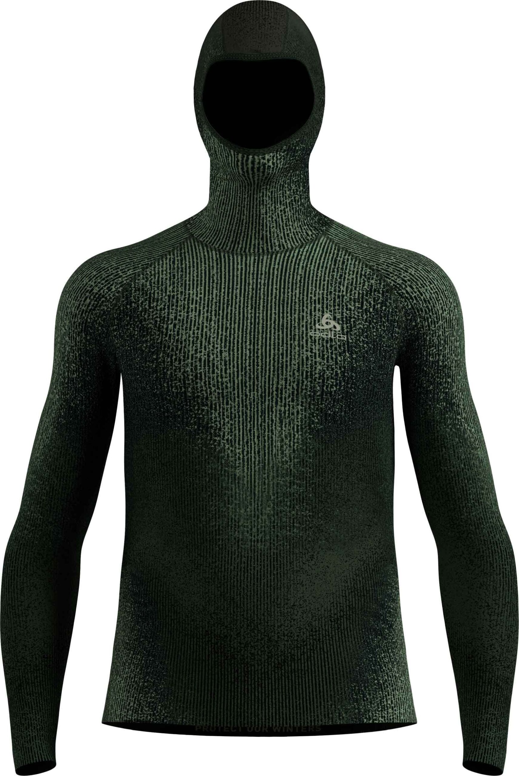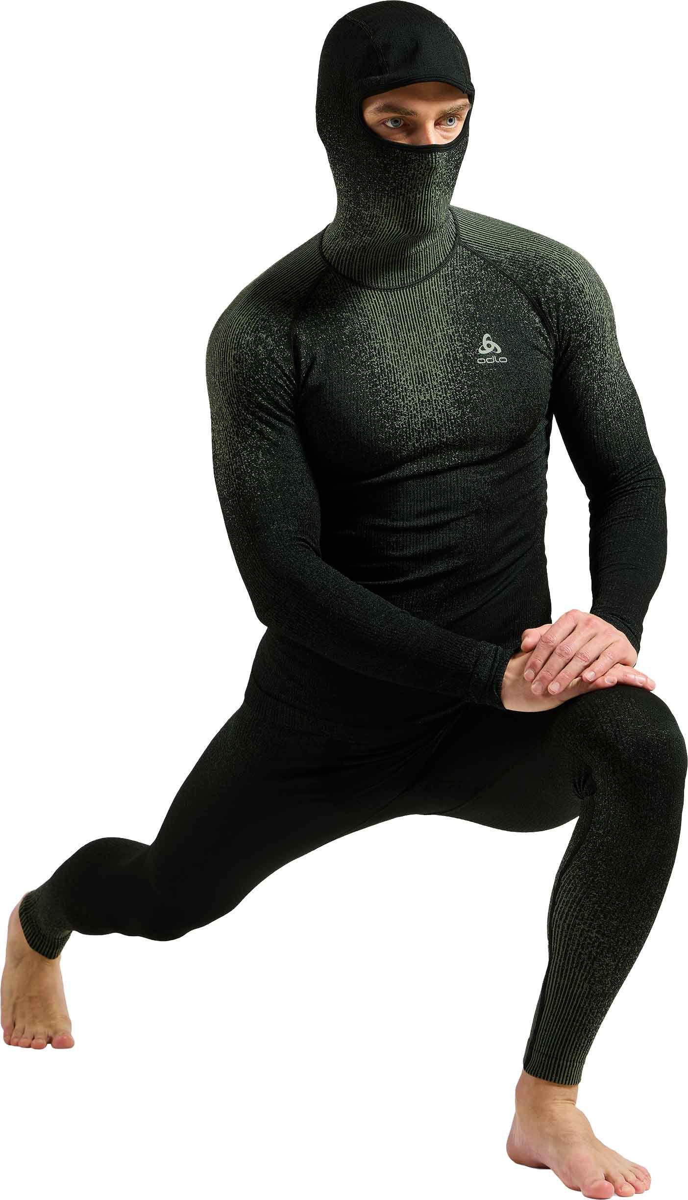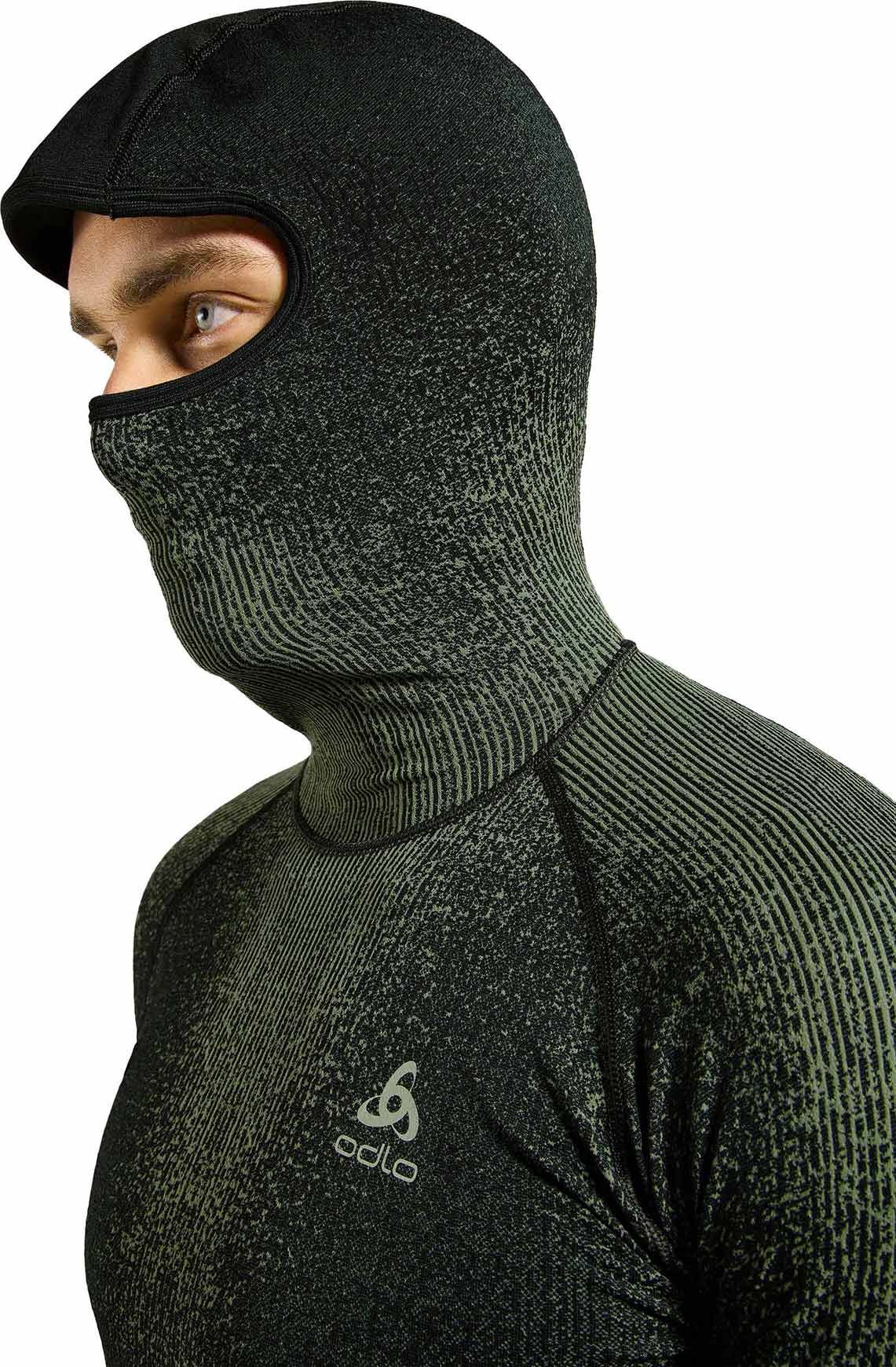 Haut technique à capuche Odlo Blackcomb Eco Urban Chic, première couche homme extensible, respirante et anti-odeurs, séchage rapide et capuche intégrale pour protéger visage et oreilles du froid pendant le ski.