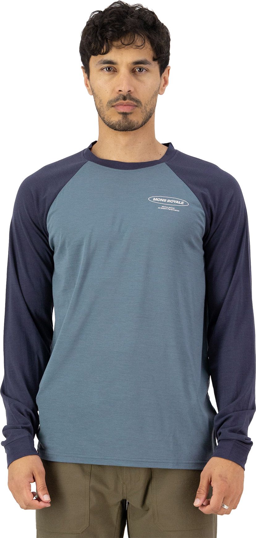T-shirt à manches longues Mons Royale Icon Merino Raglan Long Sleeve Goblin Blue/Midnight pour homme, en Merino Air-Con ultra-léger : respirant, antiodeurs, régule la chaleur et évacue l’humidité pour le VTT par temps chaud.