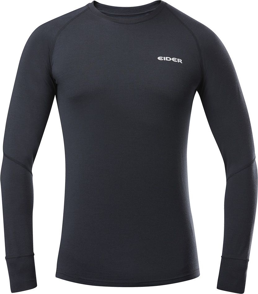 Sous-vêtement thermique Cascade Merino Crew Neck Black d’EIDER pour homme, en laine mérinos 4-way stretch respirante et anti-odeurs, offre chaleur et évacuation de l’humidité avec col rond, manches raglan et coutures plates.