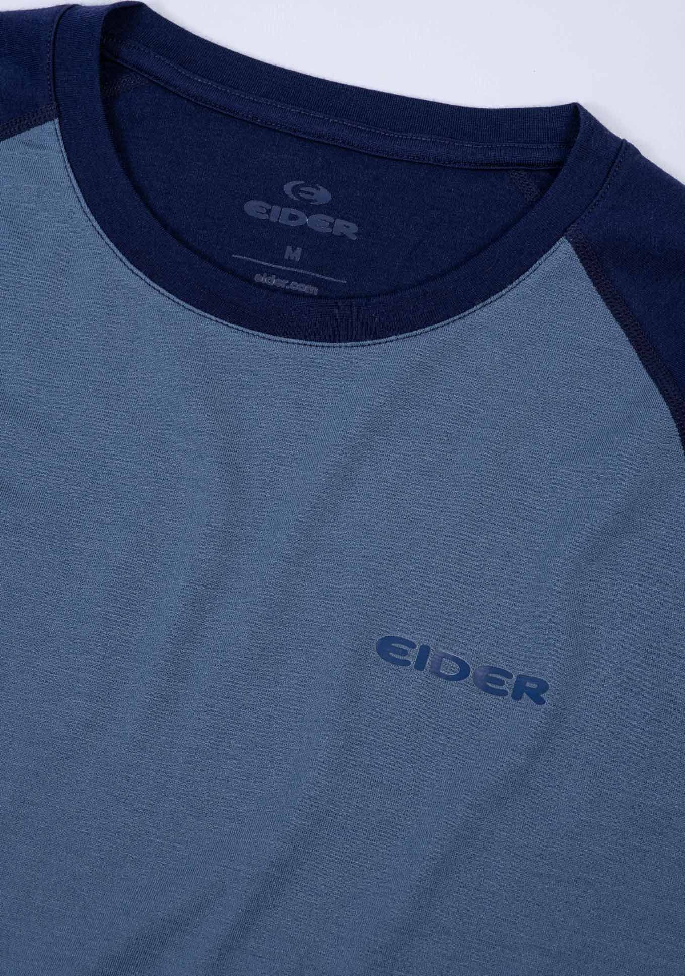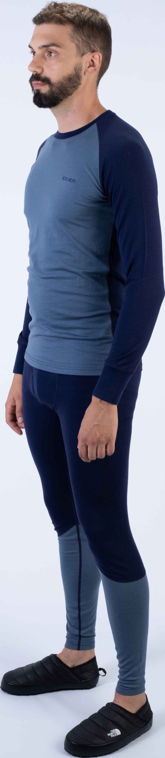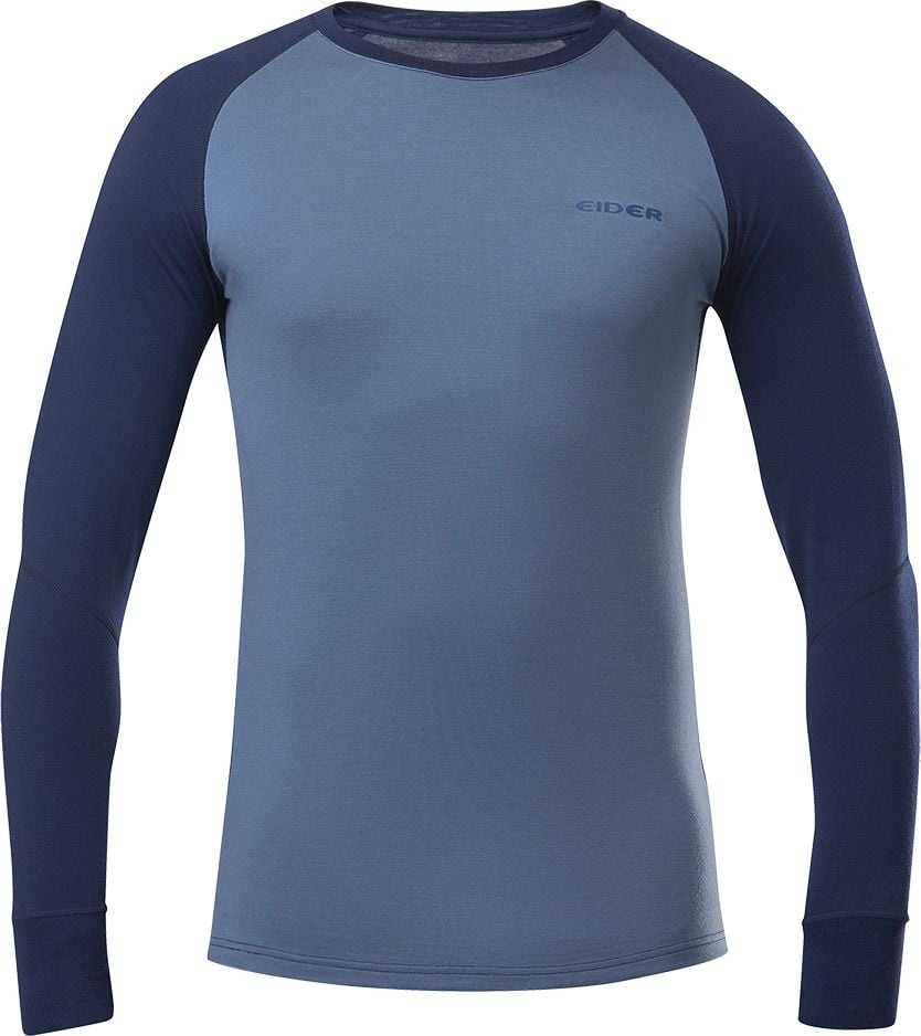 Sous-vêtement thermique homme EIDER Cascade Merino Crew Neck Storm Blue en laine mérinos 4 way Stretch, respirante et anti-odeur, col rond, manches raglan, coutures plates.