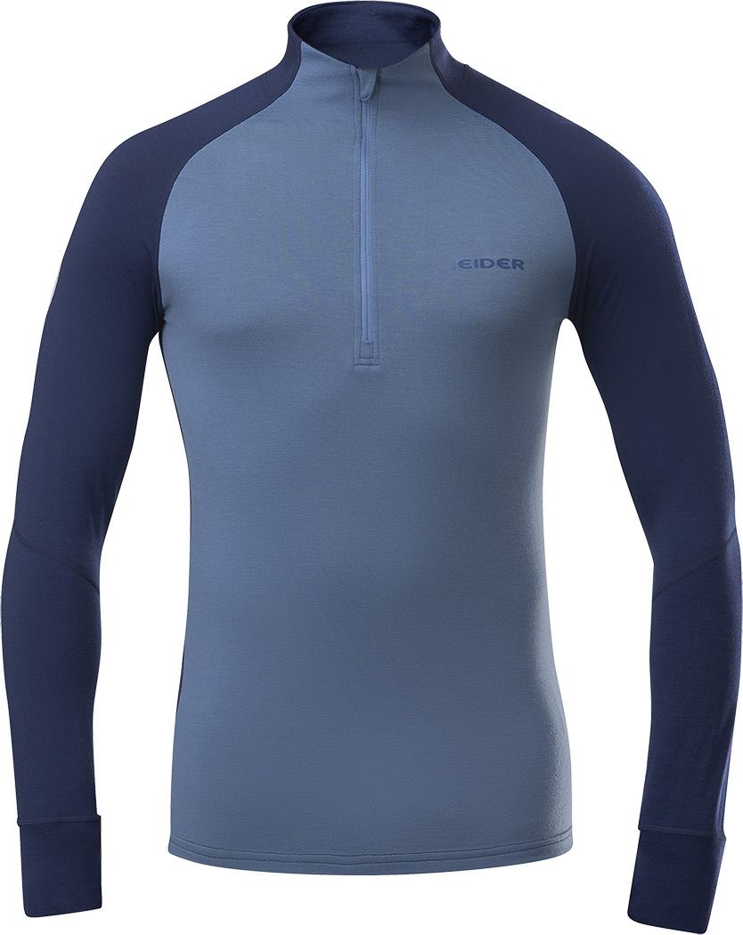 Sous-vêtement thermique EIDER Sarenne Merino Half Zip Storm Blue pour homme, en laine mérinos 4 way stretch respirante et anti-odeurs. Col demi-zip, manches raglan et coutures plates pour chaleur et liberté de mouvement au ski.