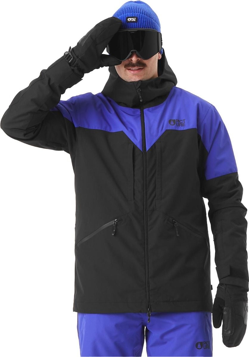 Veste de ski Picture Organic Clothing Bangup Ultramarine Black, hardshell 2 couches homme avec membrane Dryplay 20K/15K, isolation Thermal Dry System et ventilation zippée. Coupe droite, capuche et jupe pare-neige ajustables.