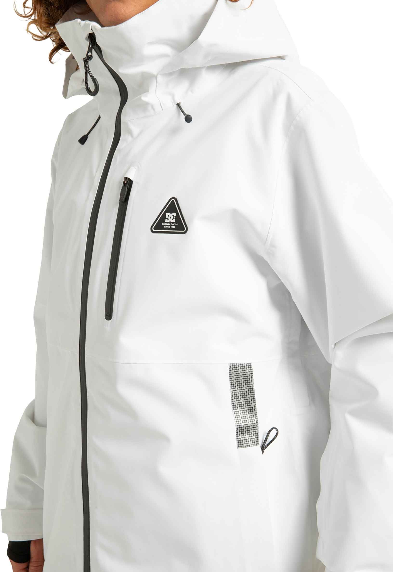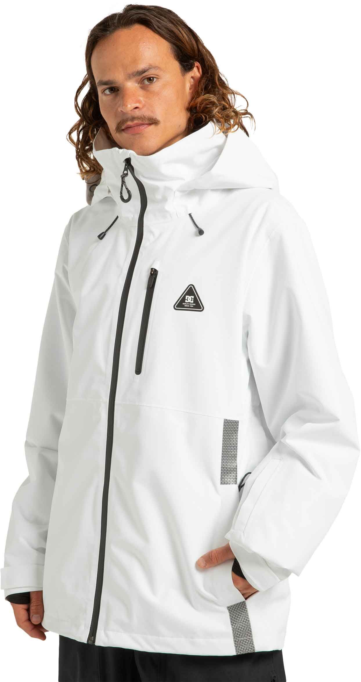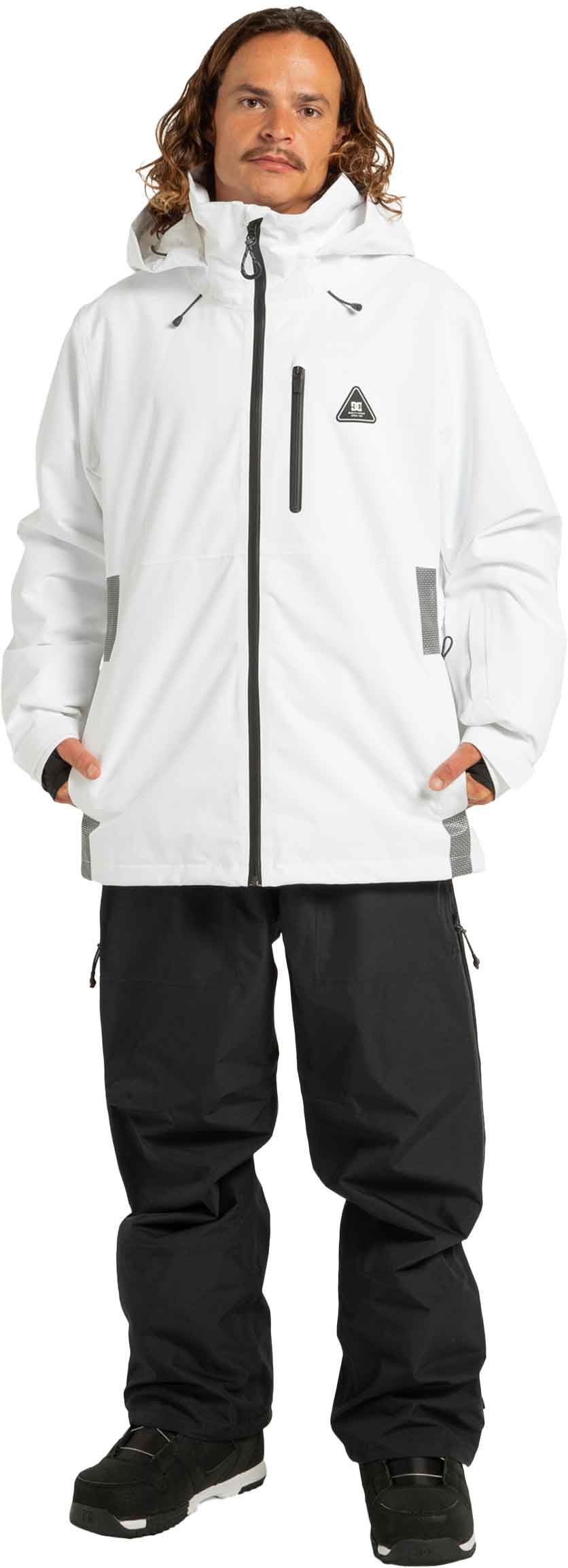 Veste de snowboard DC Shoes Basis 30K White Black en polyester recyclé, imperméable 30 000 mm et respirante 20 000 g, avec jupe pare-neige, capuche casque-compatible et coutures collées pour une protection complète sur la neige.