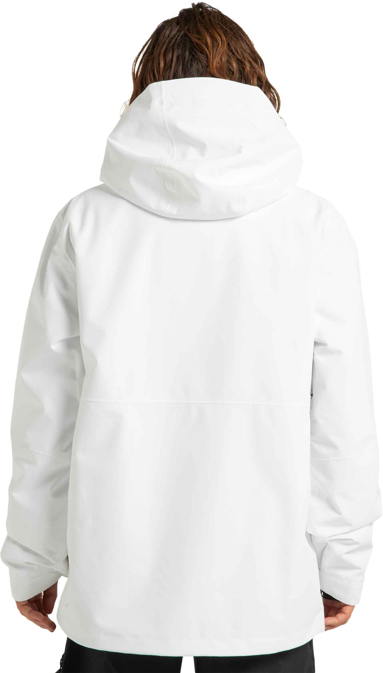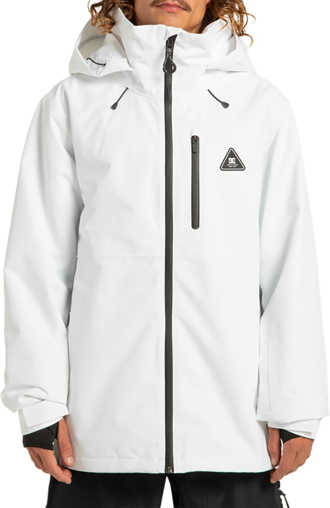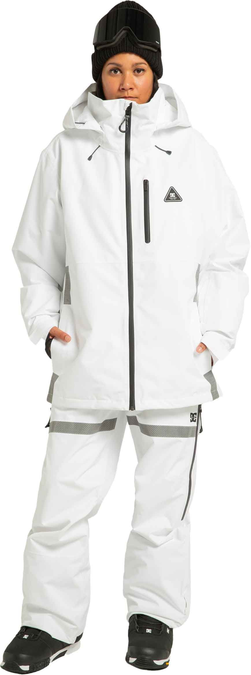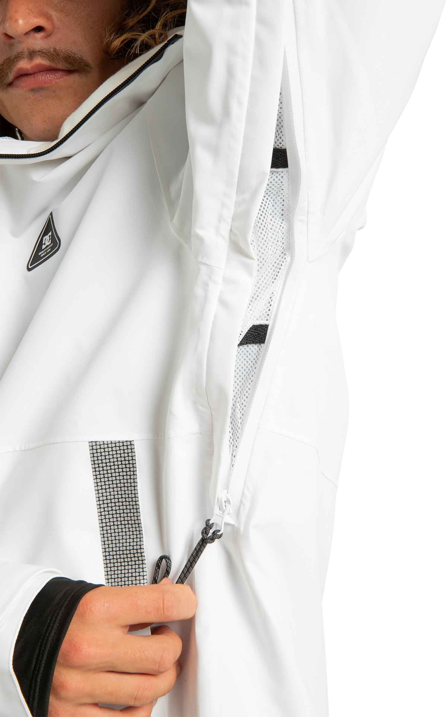 Veste de snowboard DC Shoes Basis 30K White Black en polyester recyclé, imperméable 30 000 mm et respirante 20 000 g, avec jupe pare-neige, capuche casque-compatible et coutures collées pour une protection complète sur la neige.