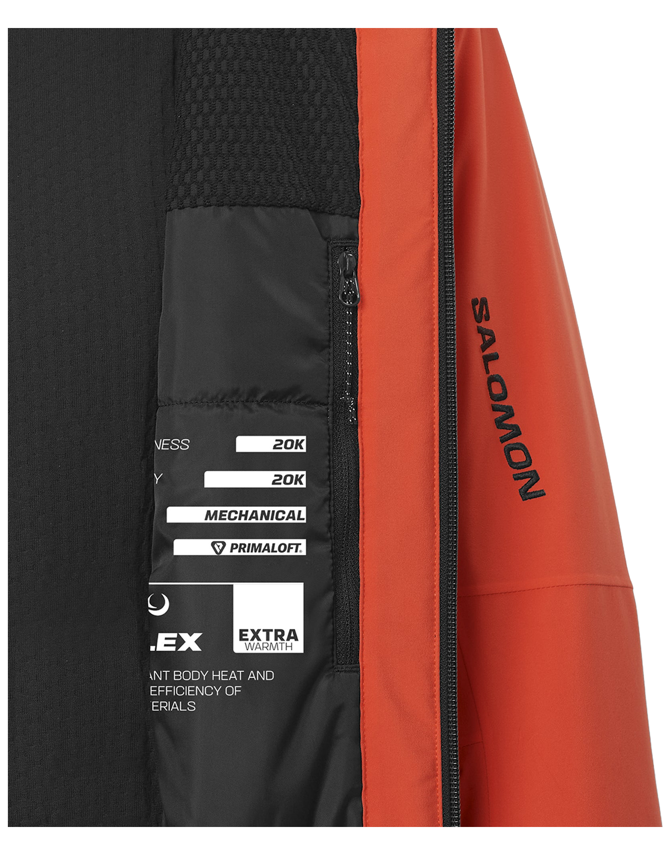 La veste de ski Salomon Brilliant 2.0 Jacket Cherry Tomato pour homme combine isolation PrimaLoft® Black et technologie HeiQ XReflex™ pour une chaleur légère et une liberté de mouvement maximale. Imperméable 20K/20K, respirante, avec capuche compatible casque, jupe pare-neige et tissu stretch, elle protège des tempêtes de neige sur les pistes.