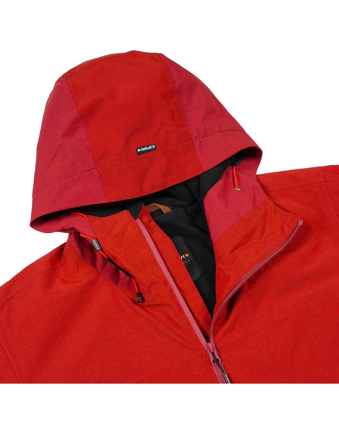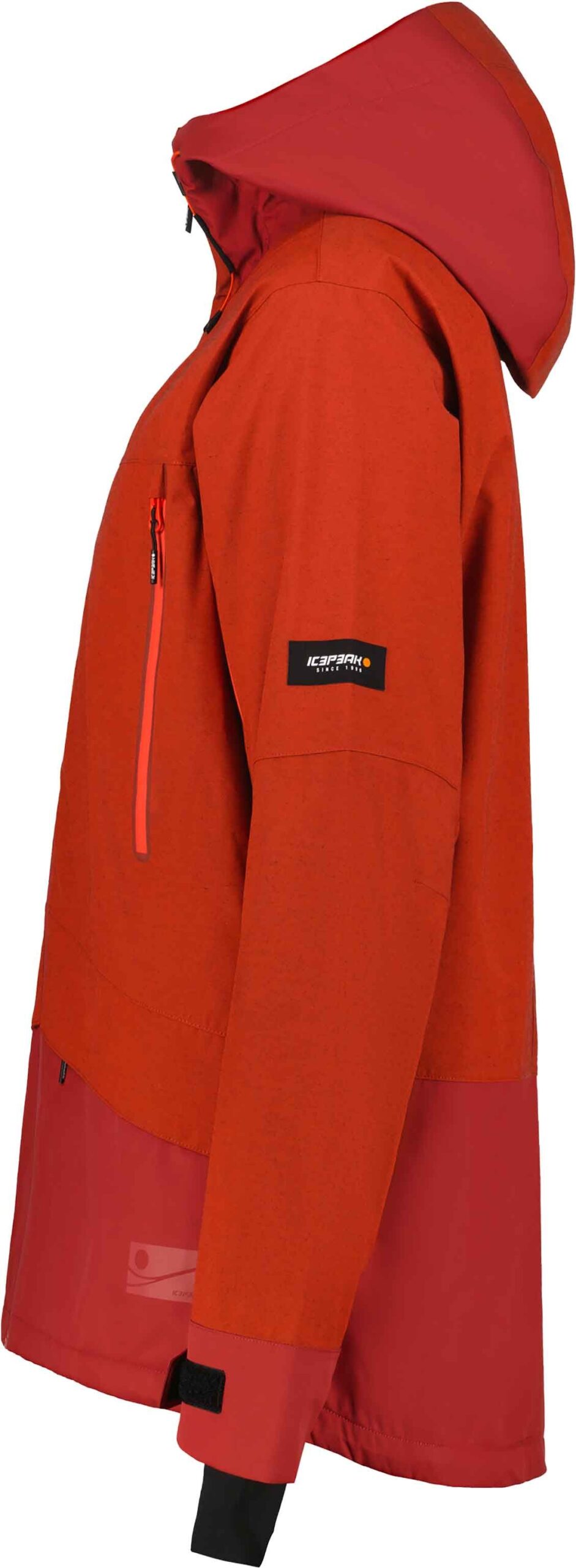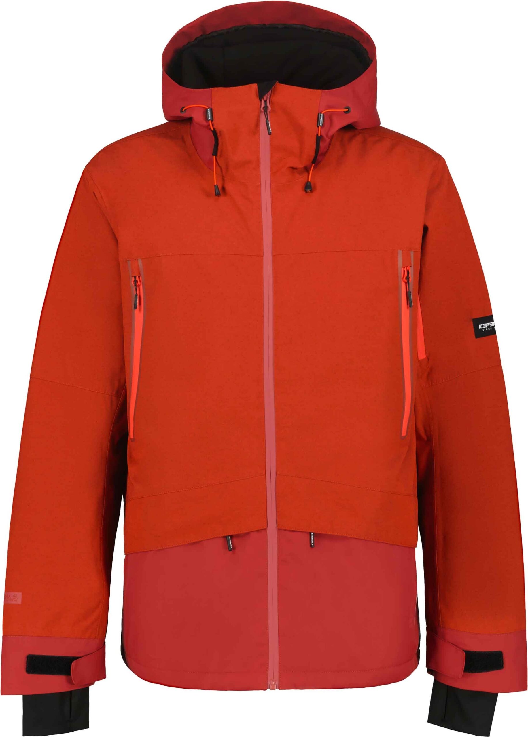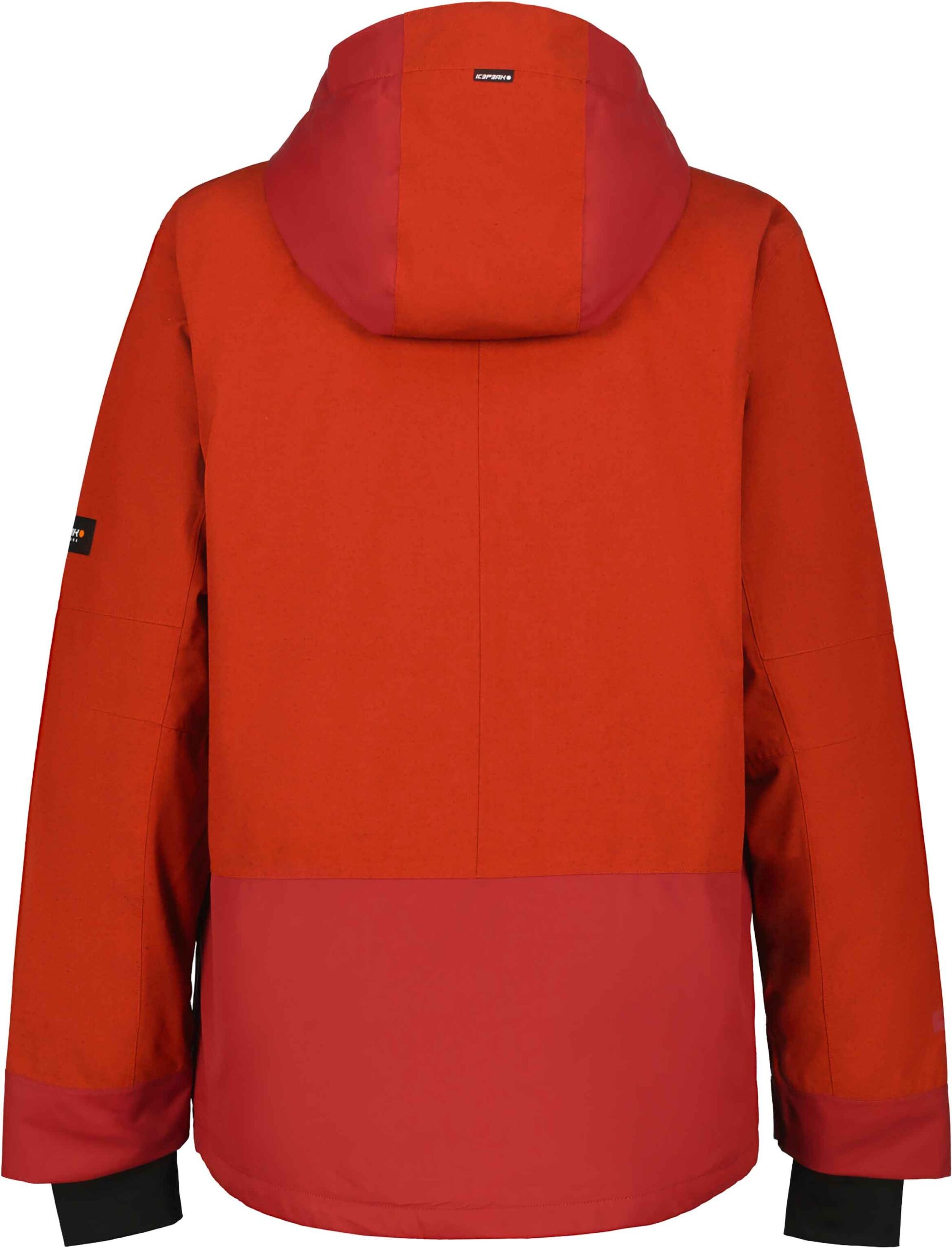 Veste technique ski Icepeak Castres Orange homme : imperméable, respirante et isolante zoned, capuche réglable, jupe pare-neige, coudes articulés pour liberté de mouvement sur piste et hors piste.