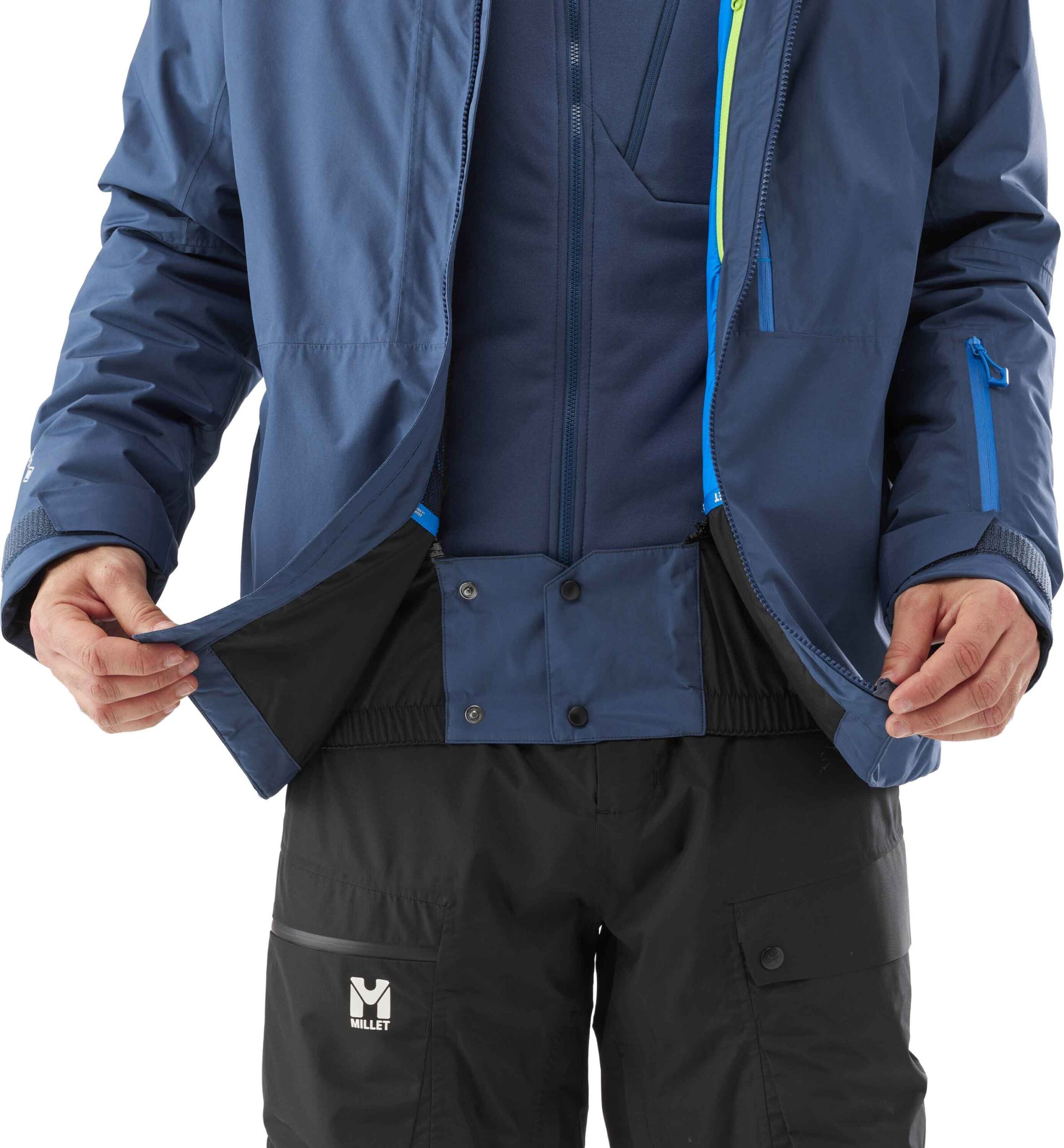 Du point de vue pratique, on trouve une capuche 3D ajustable et ergonomique, une jupe pare-neige, ainsi que multiples poches sécurisées. L’ajustement s’effectue au niveau des poignets et de l’ourlet inférieur, et des ventilations zippées sous les bras permettent une régulation rapide de la température corporelle pendant l’effort.