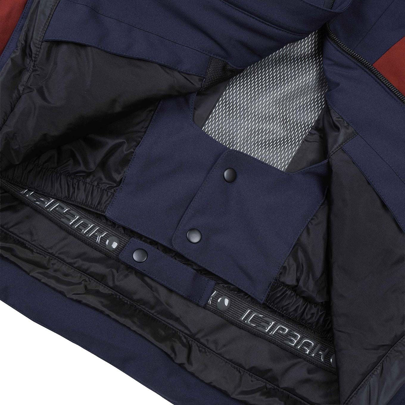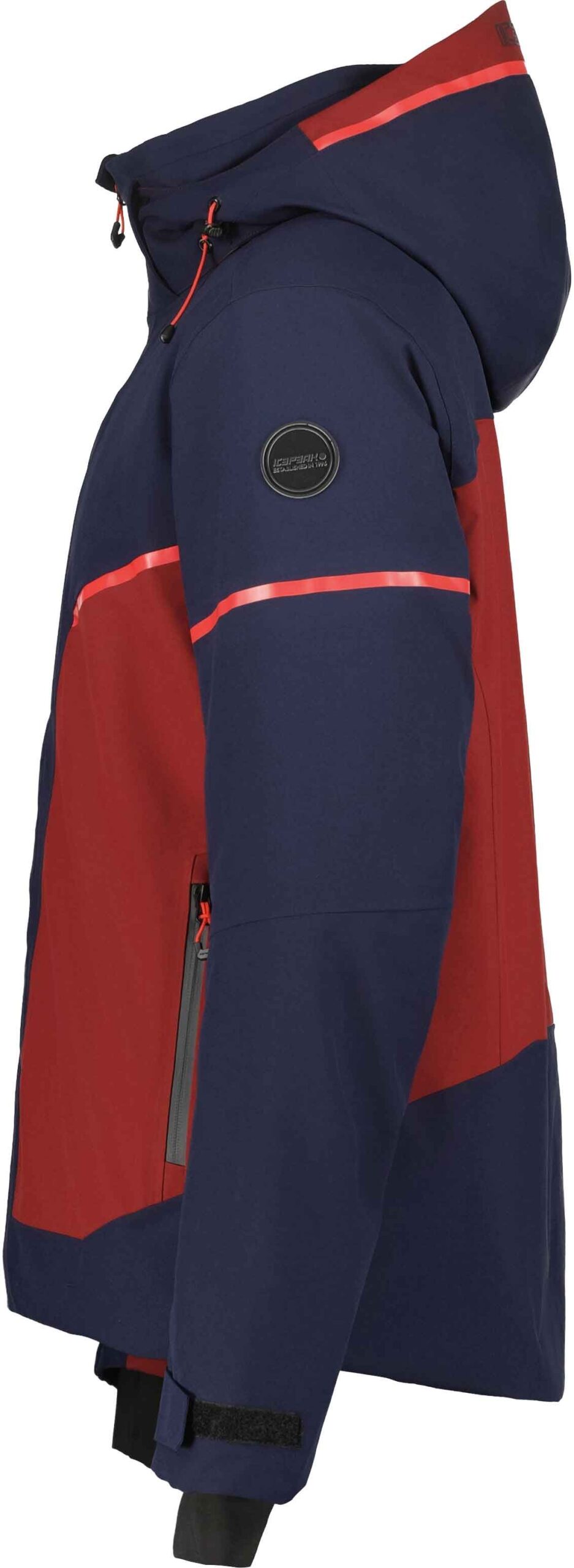 Veste de ski homme Farwell Bleu Foncé Icepeak, 2 couches membrane imperméable-respirante, capuche et jupe pare-neige ajustables, rembourrage léger, coutures étanches, extensible.
