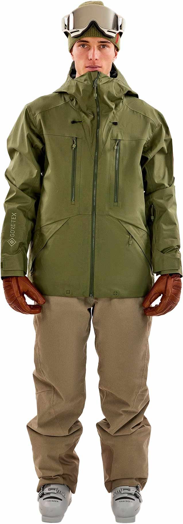 The Mountain Studio Gore-Tex Epe 3L Shell Jacket Winter Moss homme : veste hardshell 3 couches sans PFAS, coupe-vent, respirante, coutures étanchées, jupe pare-neige, pour ski/snowboard hors-piste et backcountry.