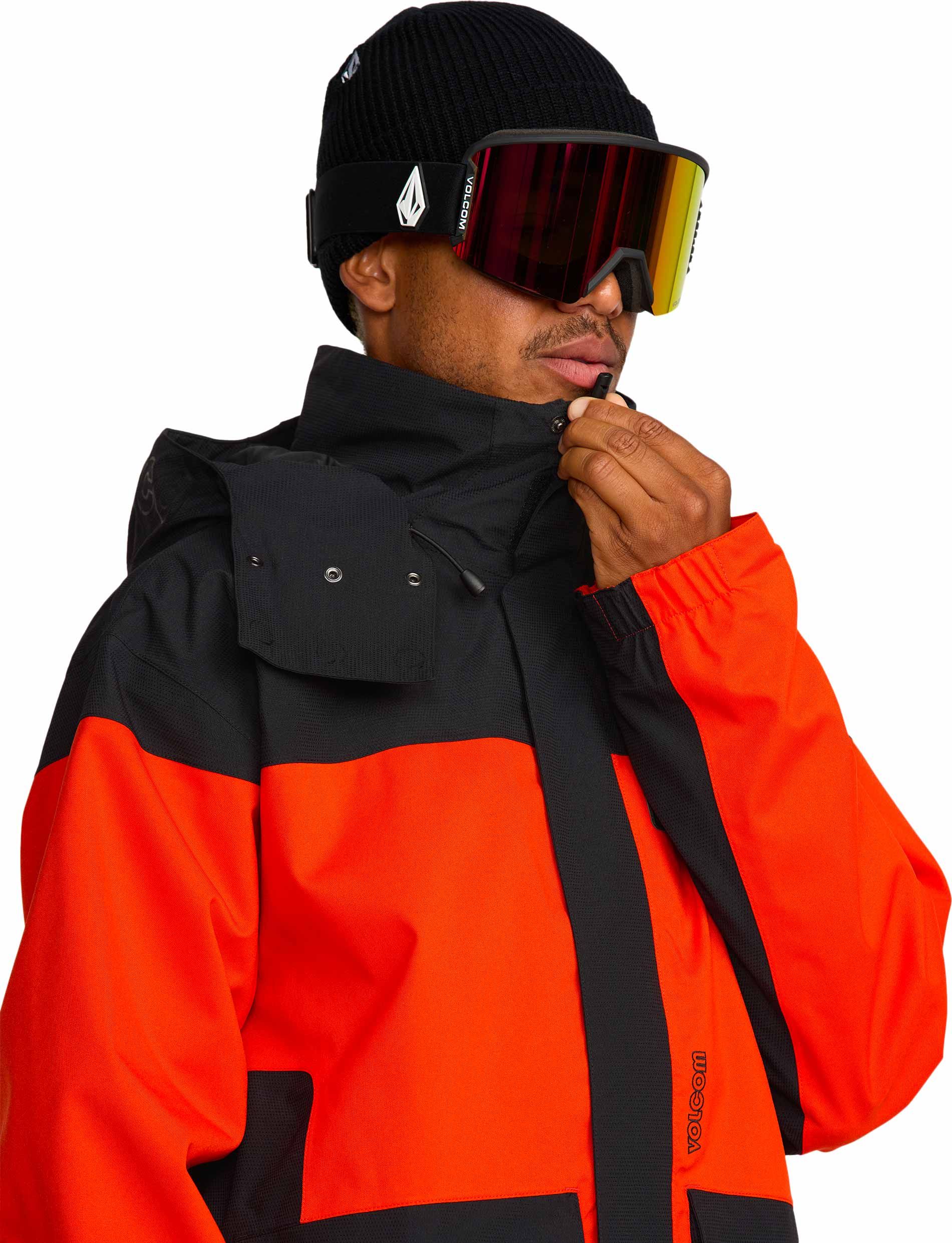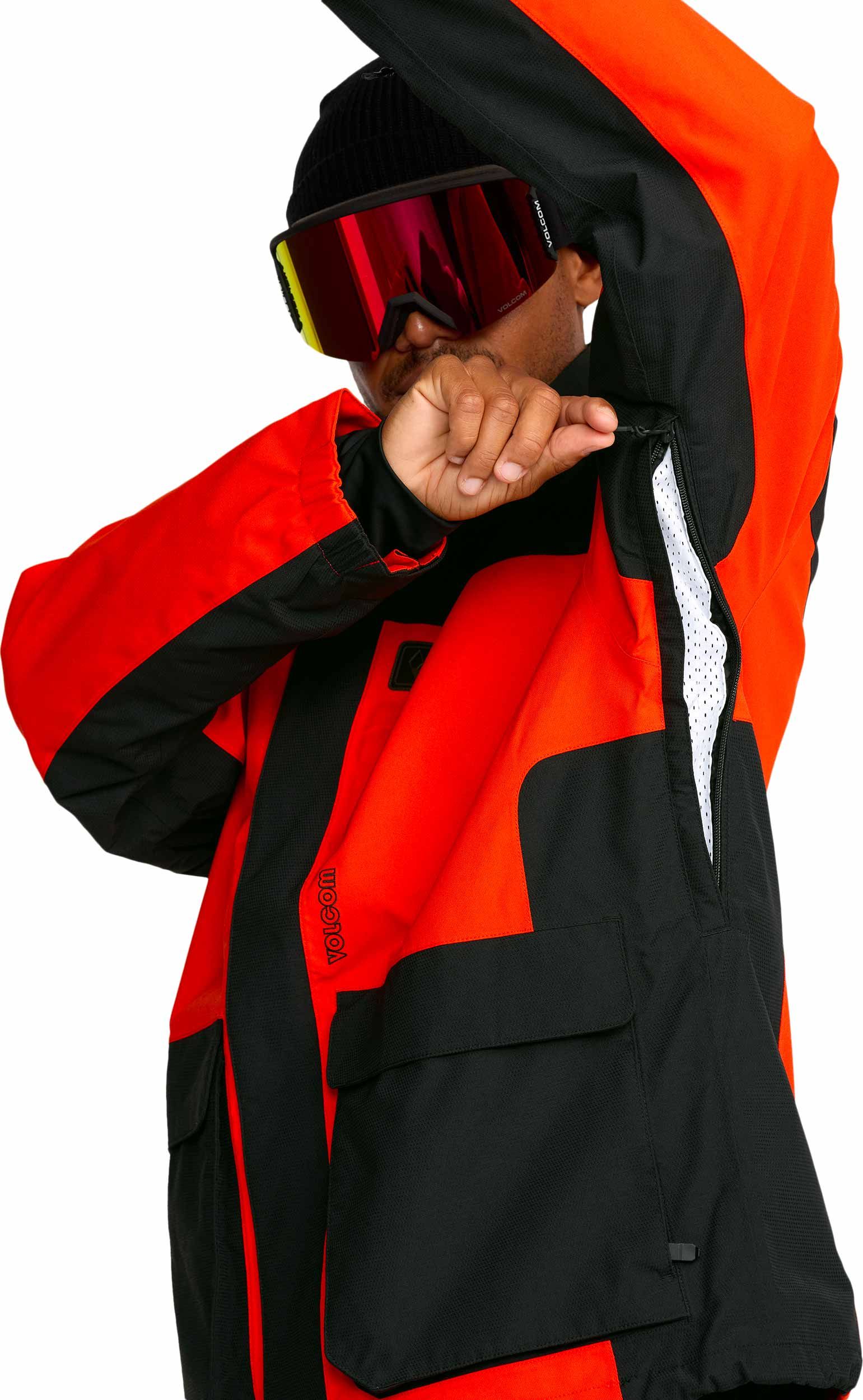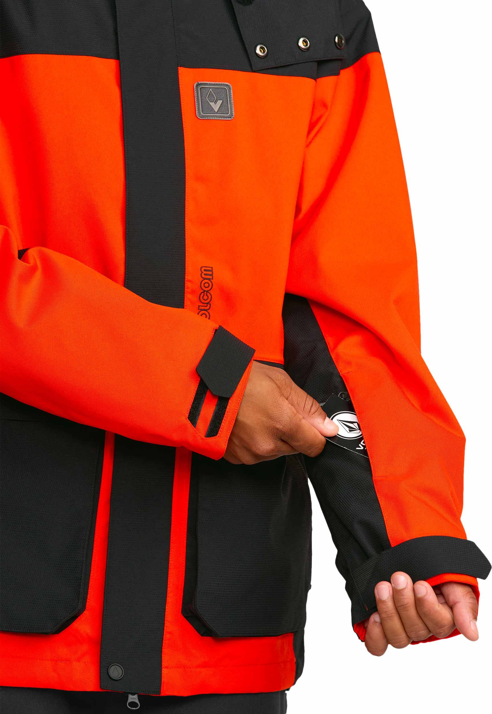 Veste de ski Volcom Kleveland Jacket Orange Shock homme, construction V-Science 2 couches, capuche amovible, aérations zippées, guêtres lycra intégrées et système Zip Tech® pour une protection optimale sur piste.