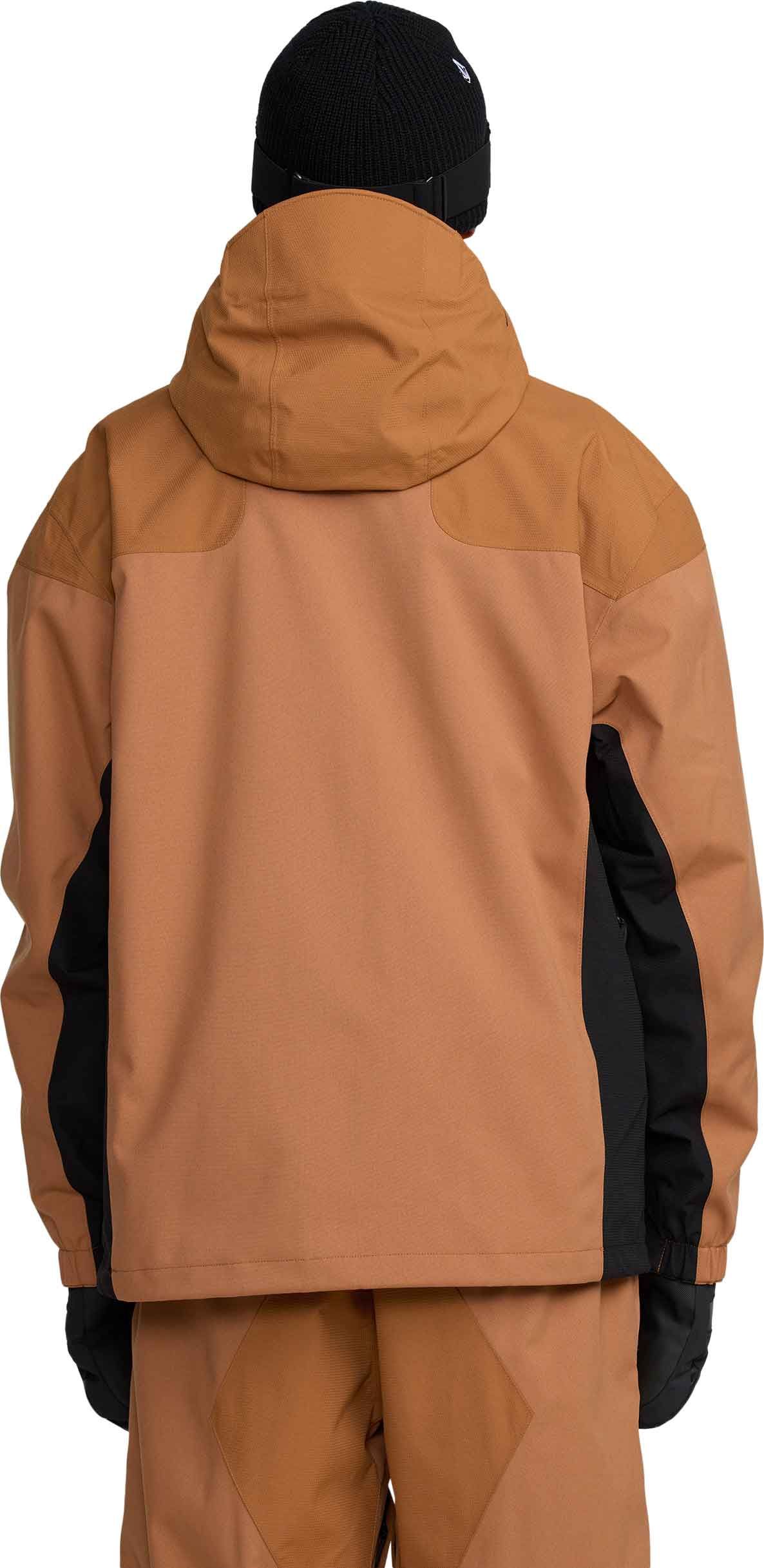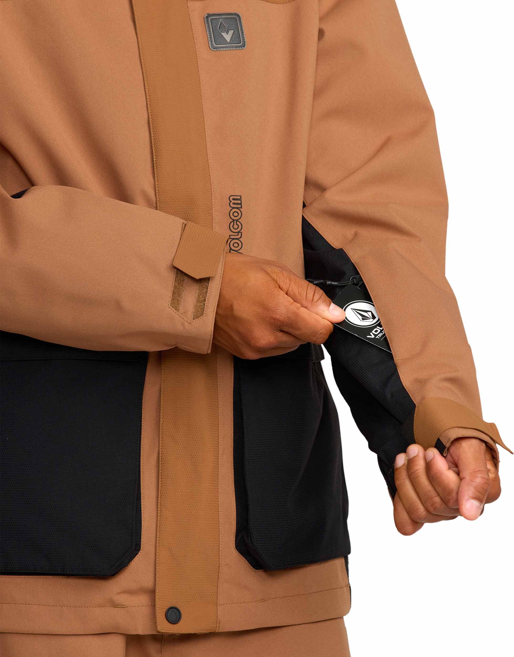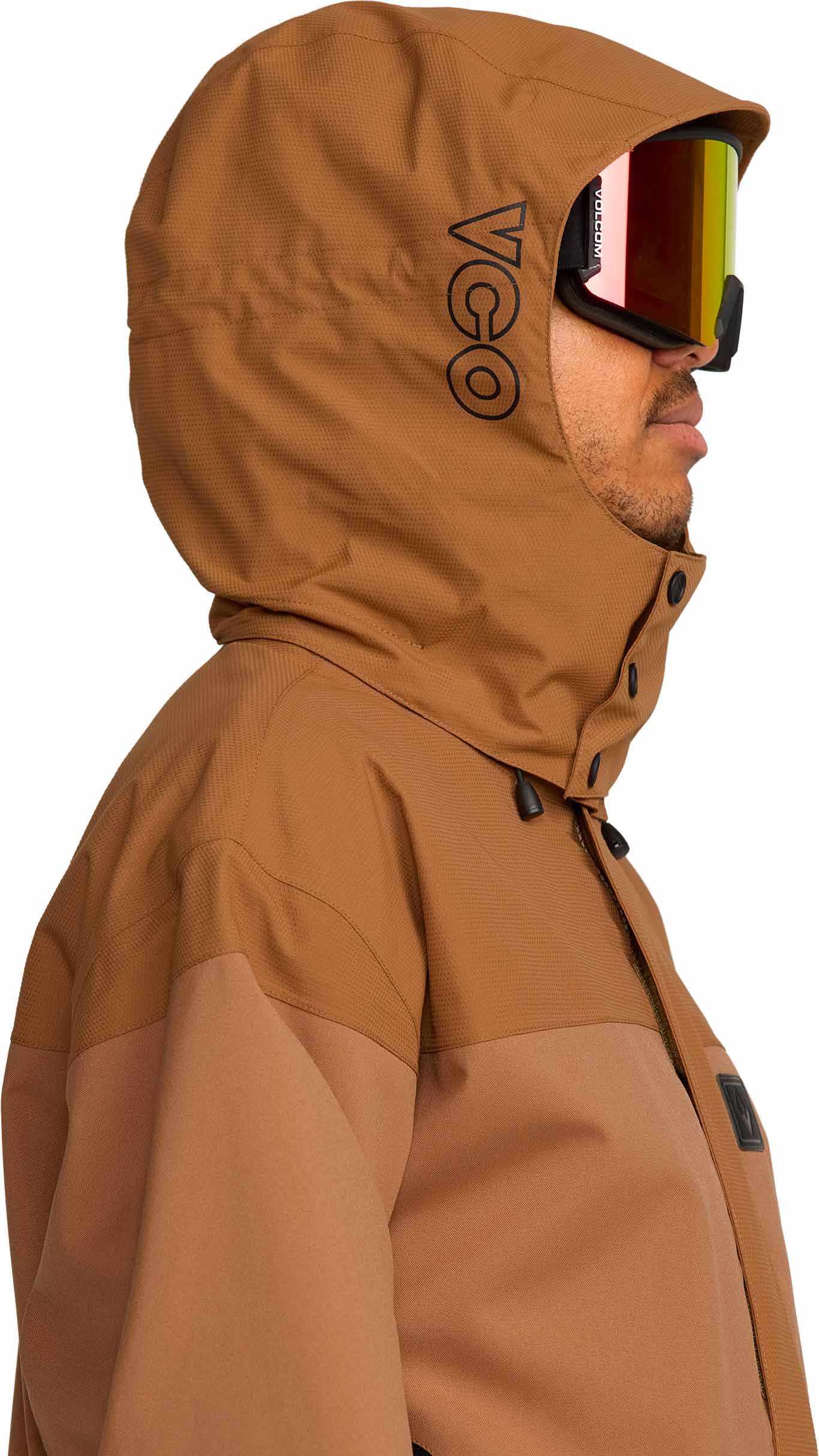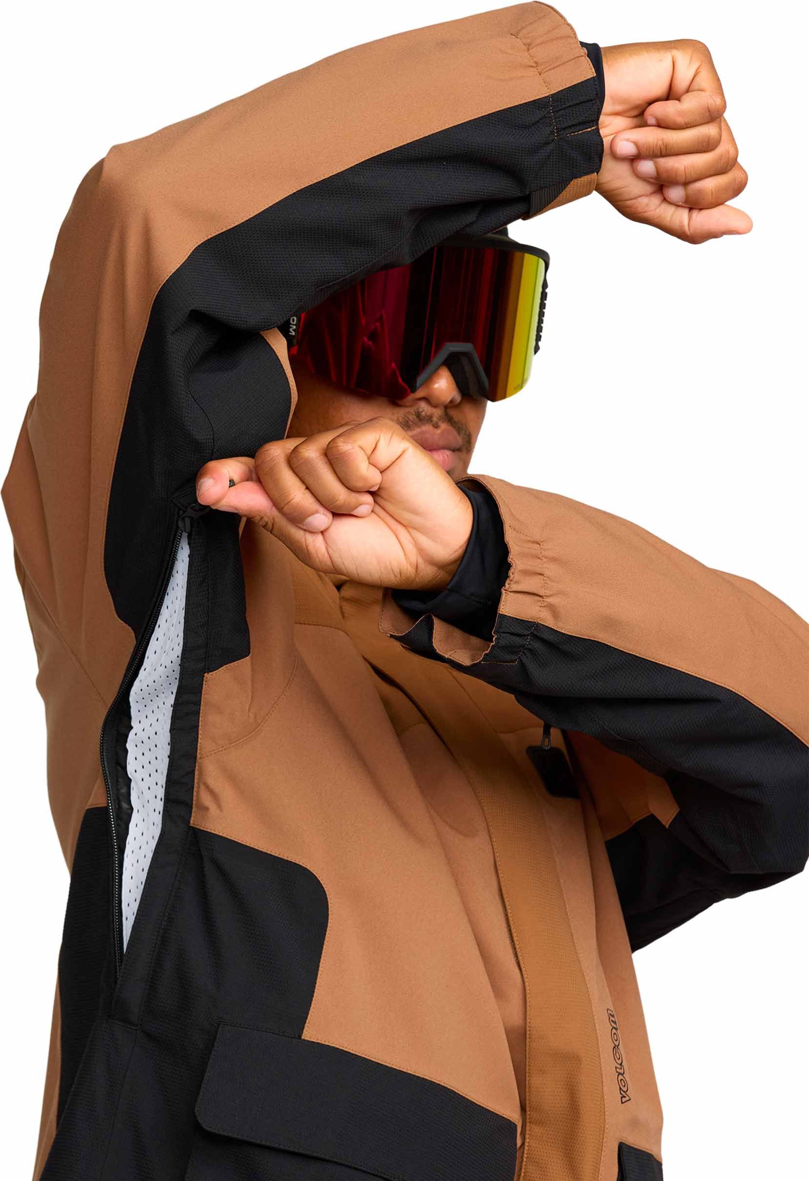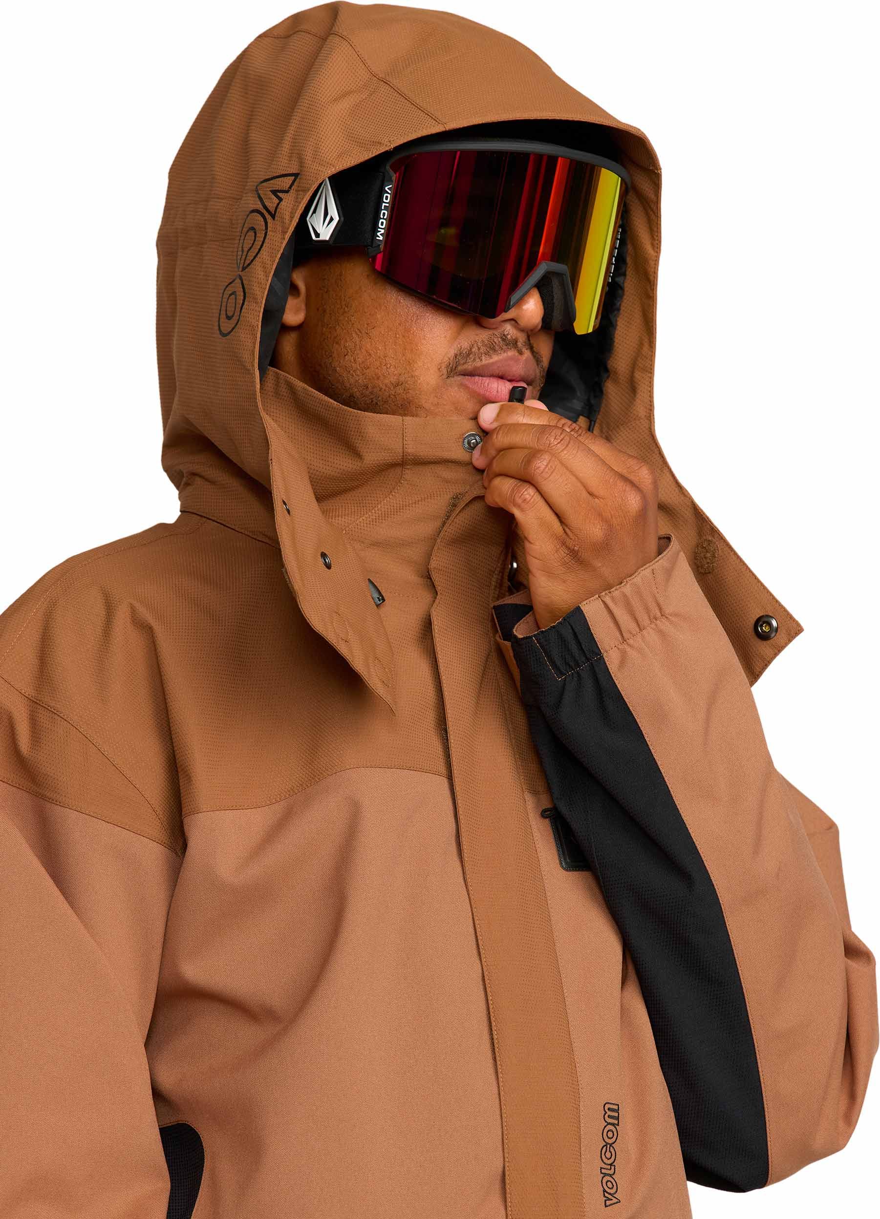Veste de ski Volcom Kleveland Jacket Terra Brown homme, construction V-Science 2 couches respirante, capuche amovible, aérations zippées, guêtres lycra intégrées et système Zip Tech® pour une protection complète contre la neige.