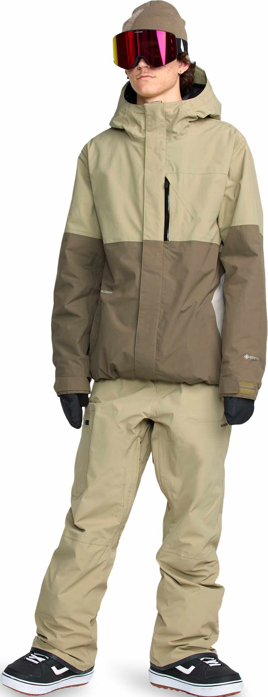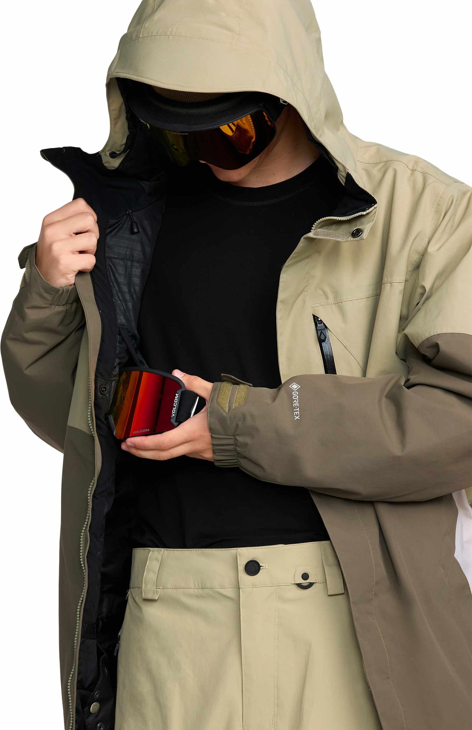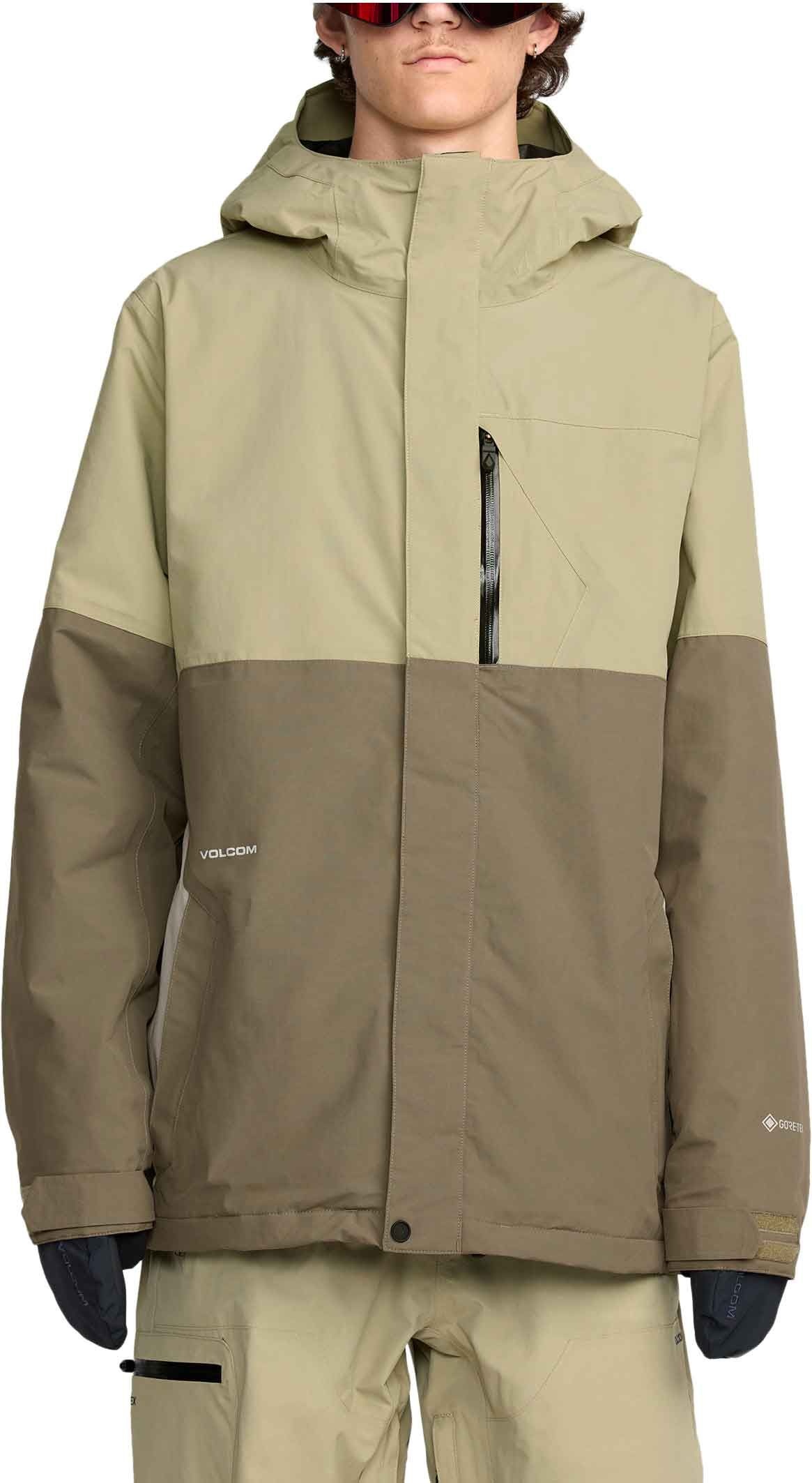 Veste de snowboard Volcom L Gore-Tex Jacket Moss Green homme, membrane GORE-TEX ePE imper-respirante, doublure V-Science, coutures scellées, capuche réglable, jupe pare-neige et ventilation.