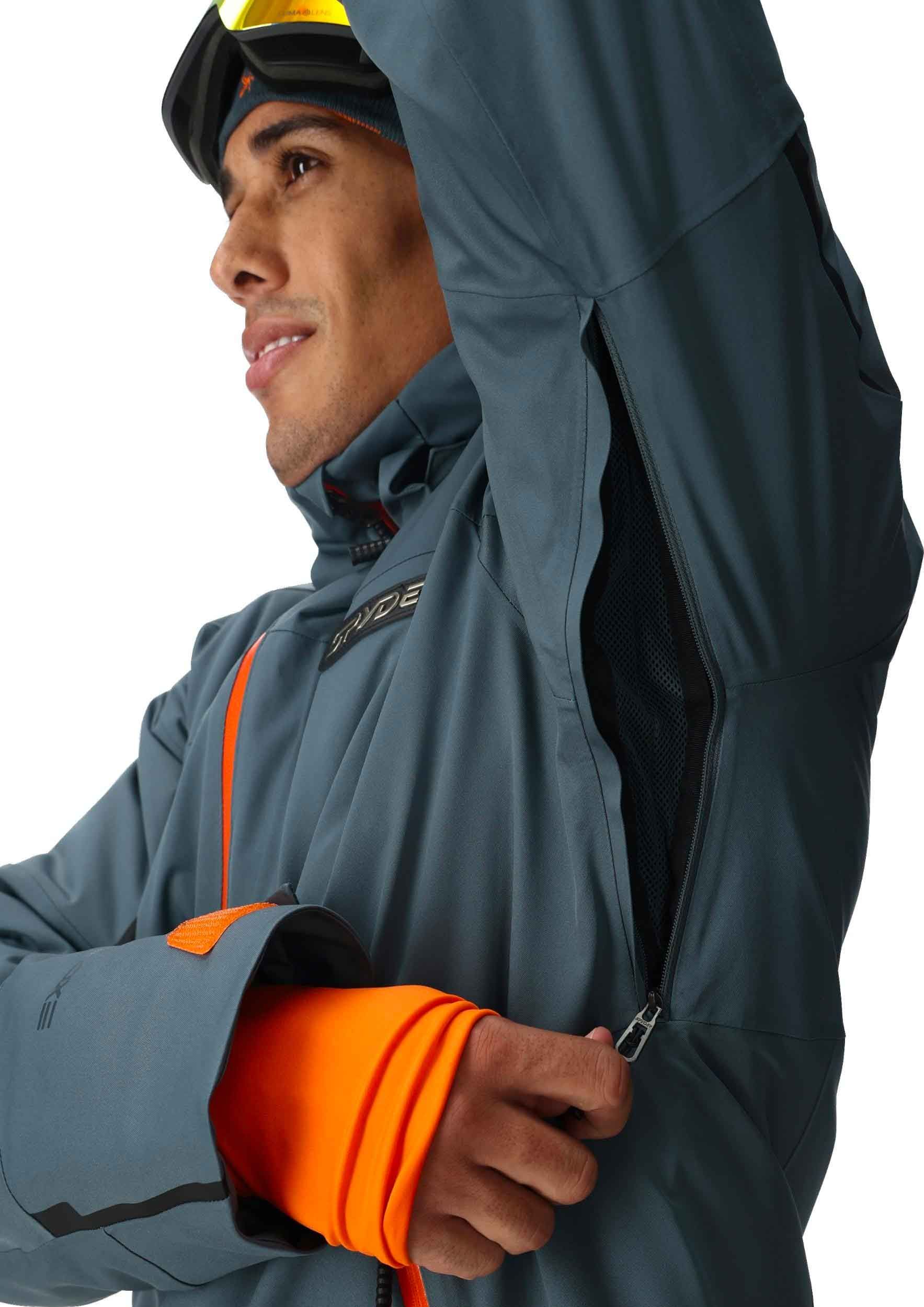 Veste ski Spyder Leader Slate Blue homme : membrane EXO SHIELD 30K 100 % polyester recyclé, isolation PrimaLoft® Black ECO, zips ventilation étanches, capuche casque compatible et jupe pare-neige amovible.
