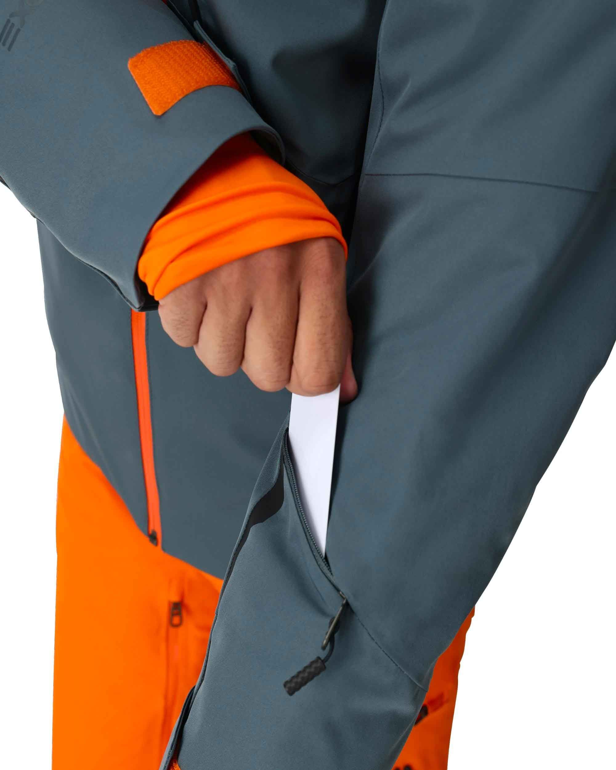 Une circulation optimale de l’humidité est permise par un système de ventilation équipé de zips étanches sous les aisselles, améliorant ainsi la respirabilité de la veste. La capuche, compatible avec un casque de ski, peut être retirée. Dans les zones stratégiques, des panneaux en matière extensible sont intégrés pour offrir une liberté de mouvement maximale.