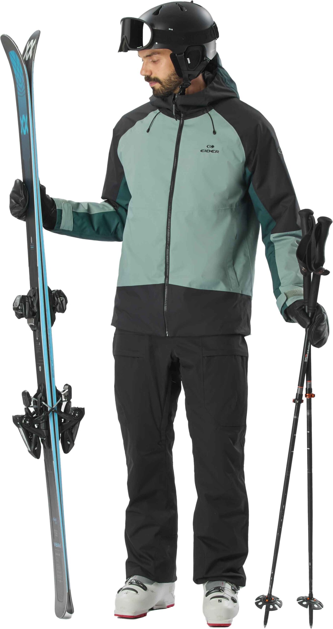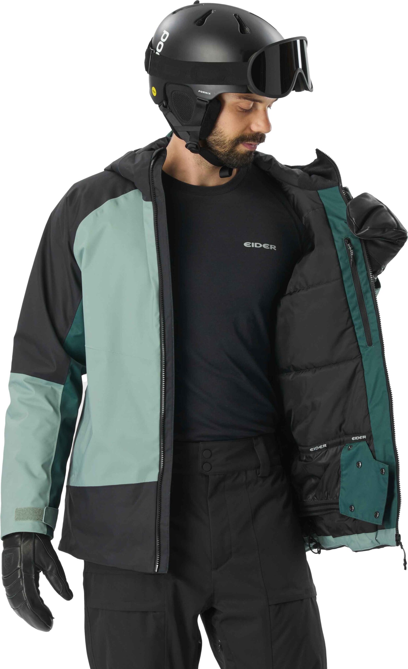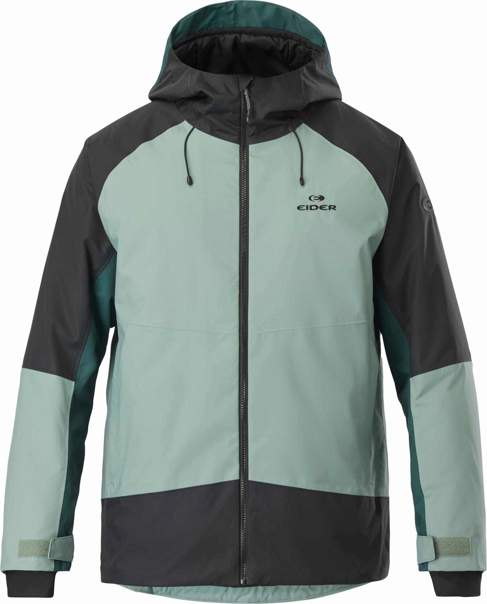 Veste isolante EIDER Arias 2L Insulated Jkt Green Clay homme, membrane Defender imperméable-respirante, isolation recyclée stratifiée, coupe articulée, capuche réglable, jupe pare-neige et poches ski.