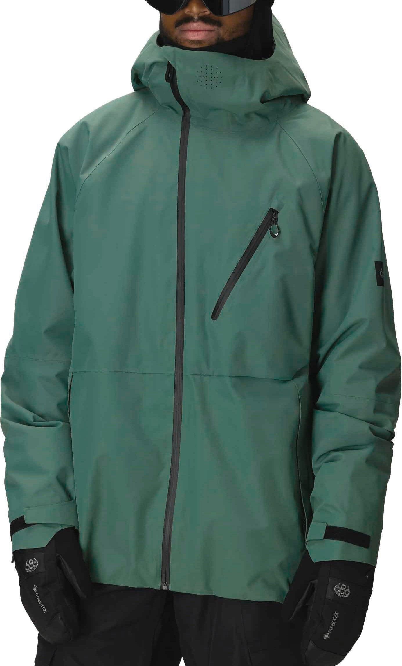 Veste ski homme 686 Hydra Thermagraph Jacket Cypress Green : membrane imper-respirante, coutures scellées, isolation Thermagraph® ciblée, capuche casque-compatible et jupe pare-neige pour freeride hivernal.