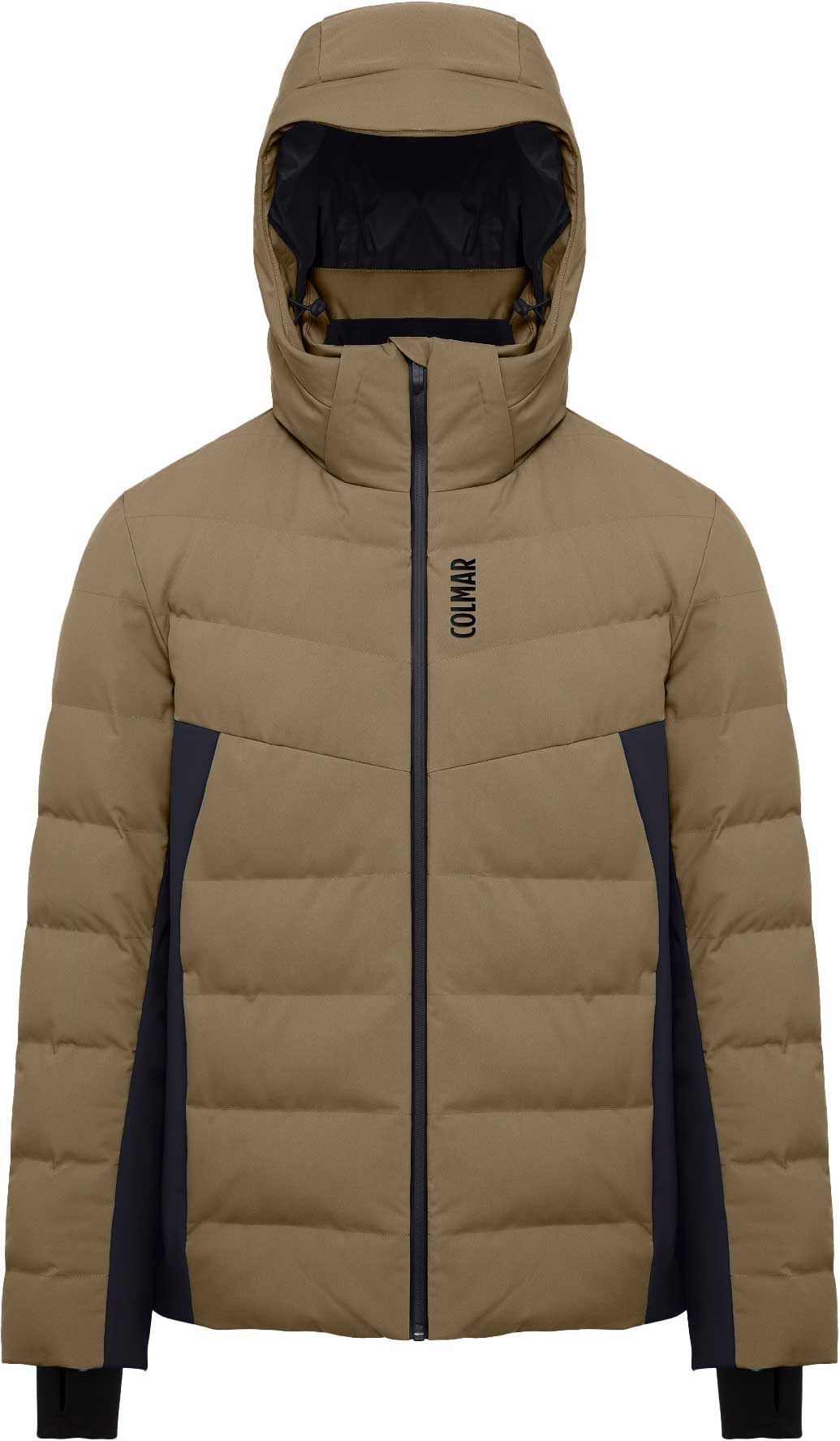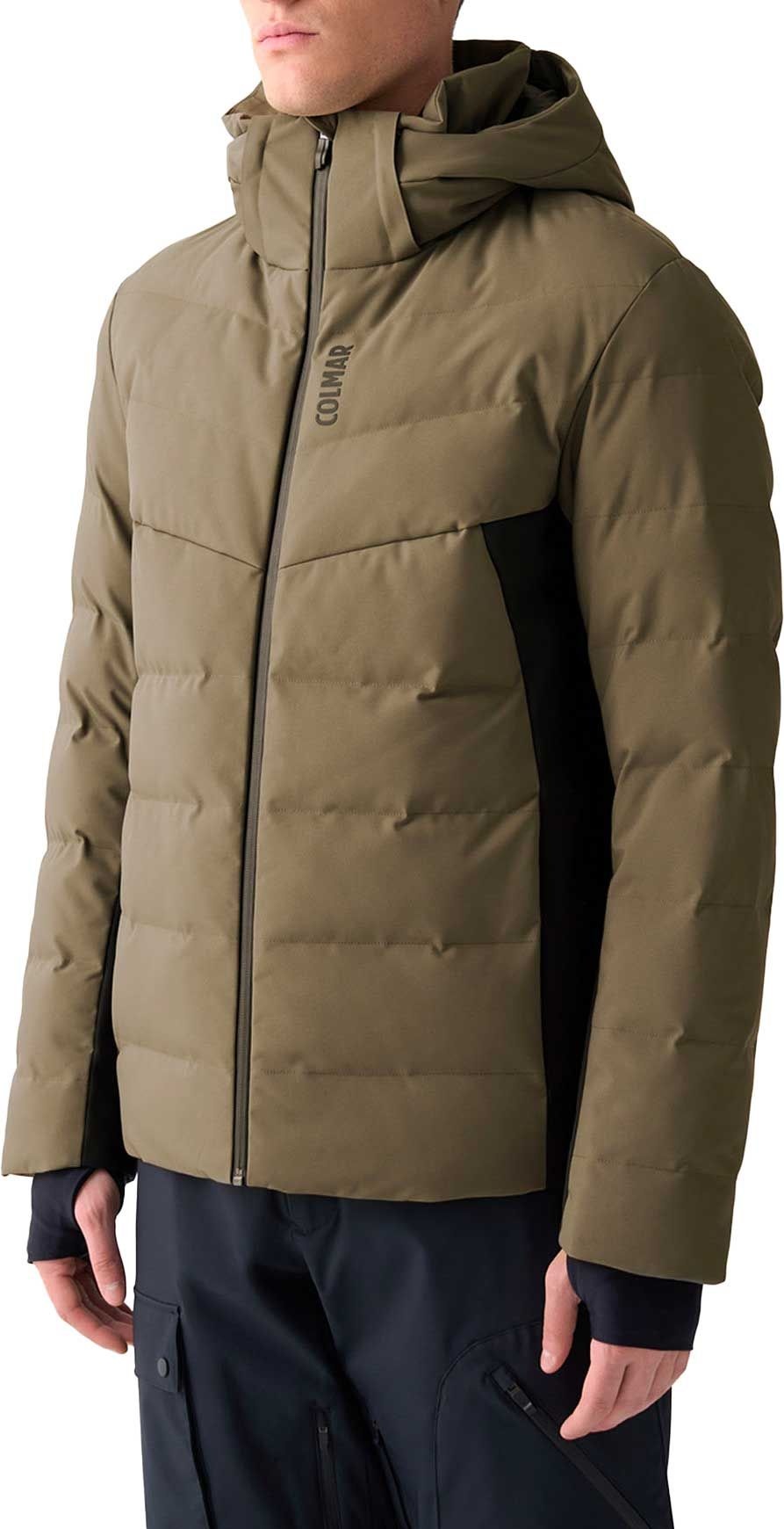 Veste de ski Colmar Men Ski Puff Jacket Woodland Black pour homme, 100 % matériaux recyclés, imperméable et respirante, avec Microflock Re-padding et Ecosoft pour chaleur légère, capuche amovible et jupe pare-neige.