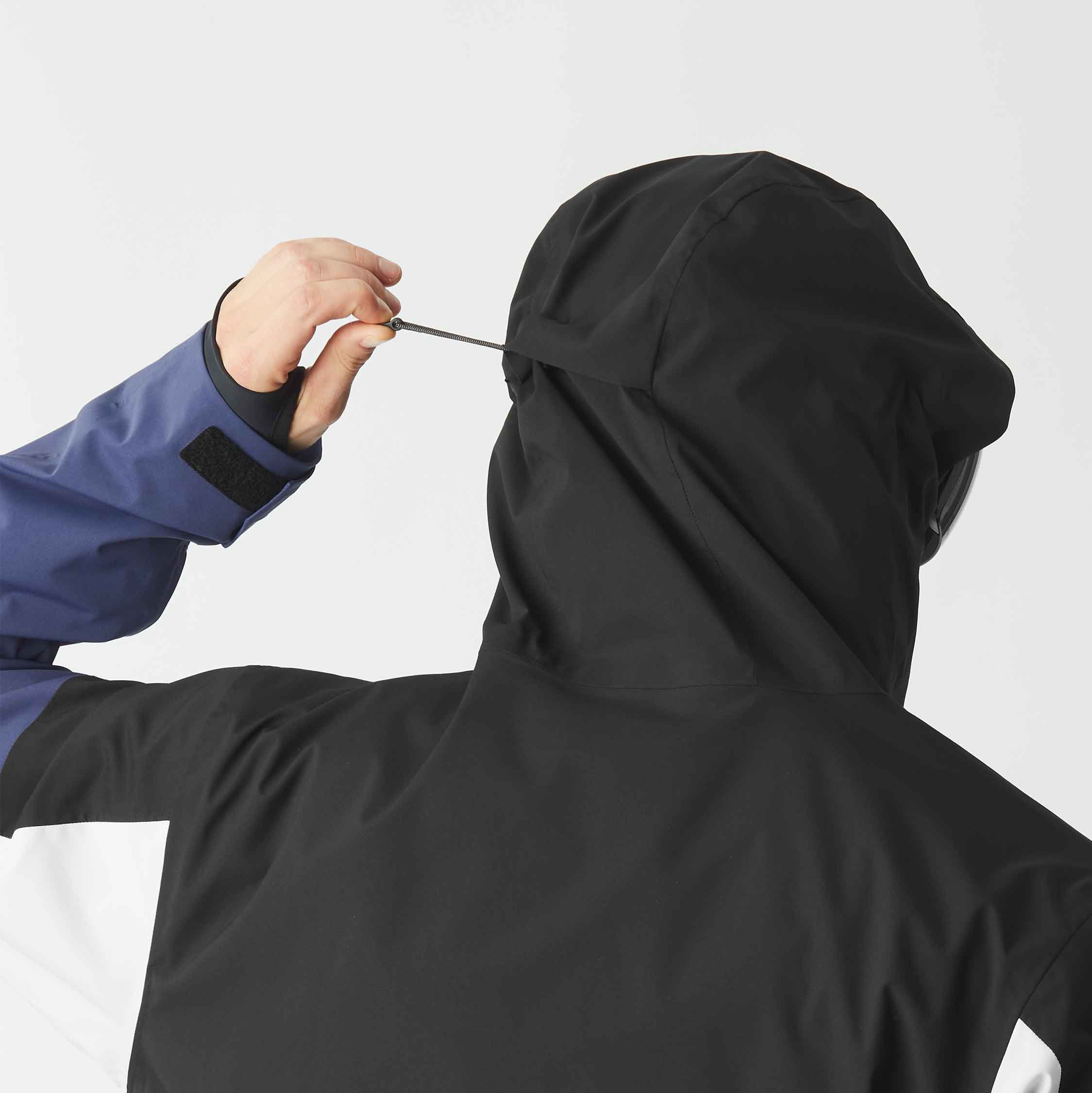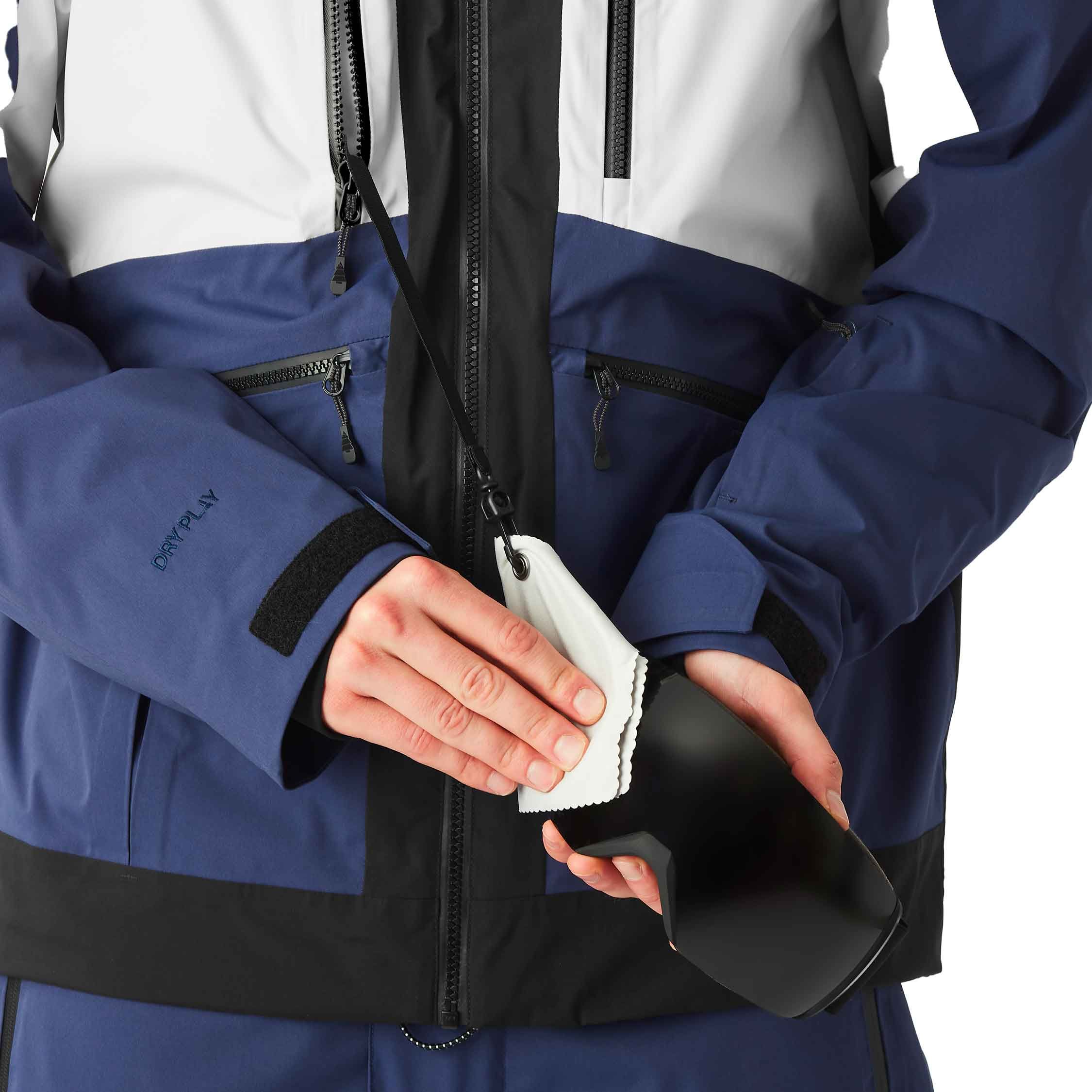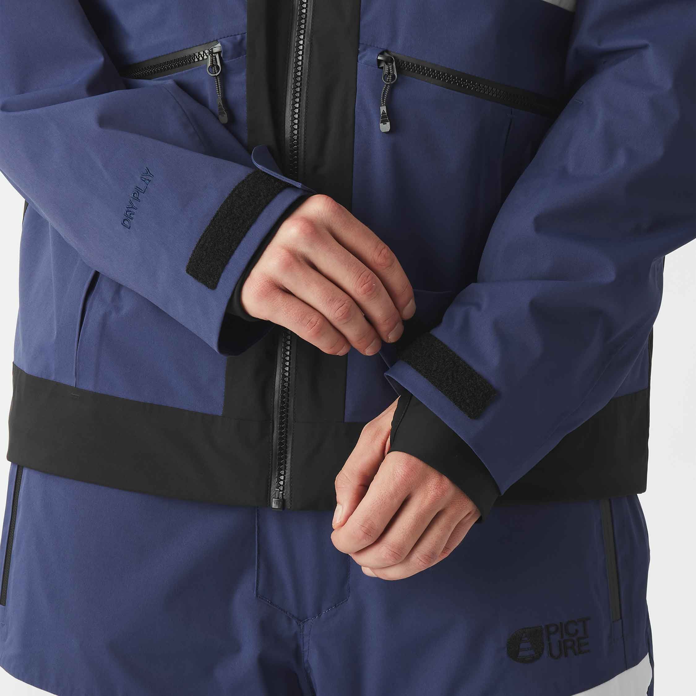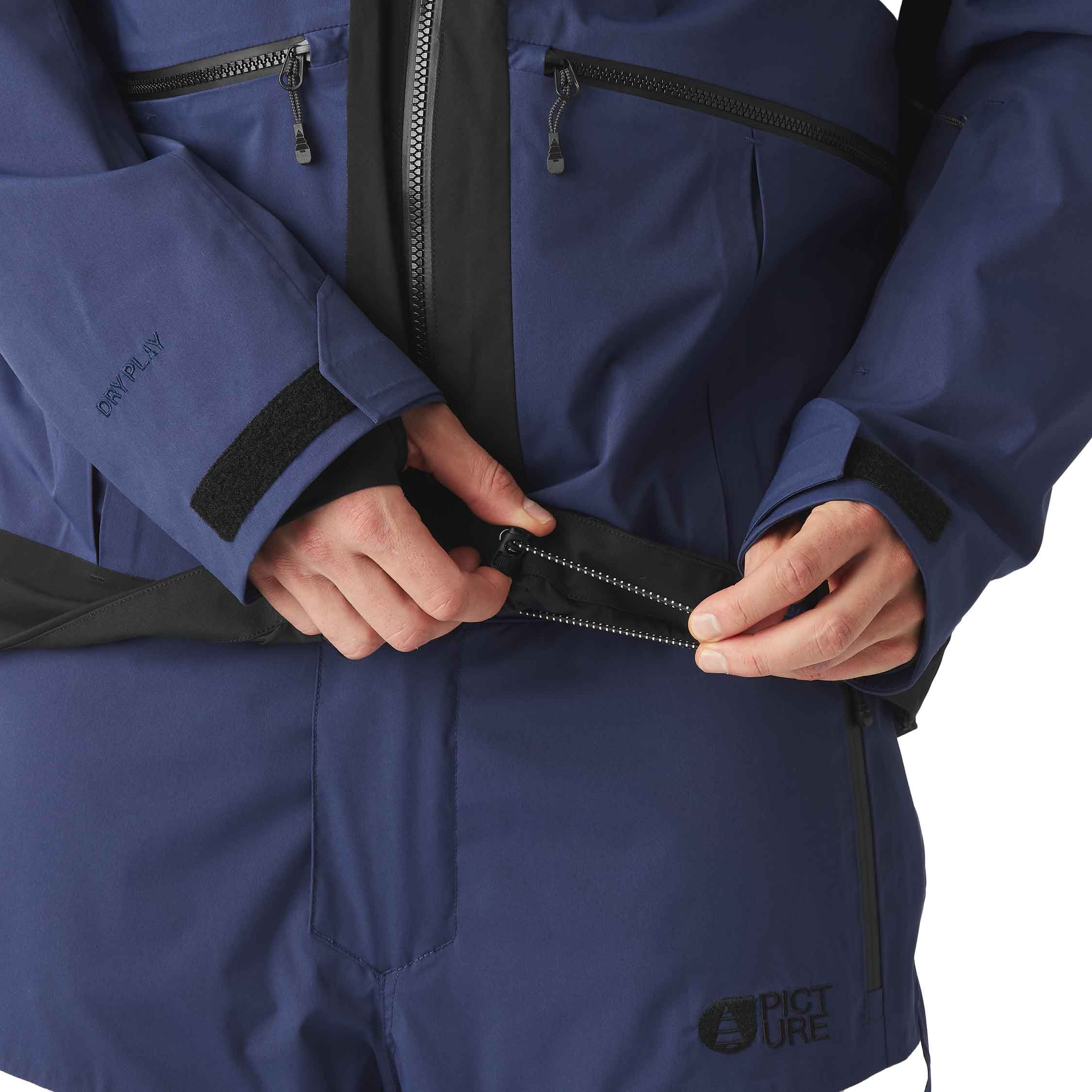 L’humidité et la neige sont repoussées par le traitement déperlant Teflon Ecoelite™ sans PFC, les coutures cousues-collées intégrales et les zips étanches. La capuche, les poignets et la jupe pare-neige (fixable au pantalon) sont ajustables pour une protection et une ergonomie renforcées.
