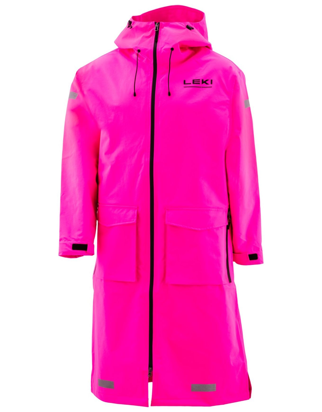 Cape de pluie Leki Rain Coat WCR Pro Pink, coupe longue protégeant pantalon et sac, 2 poches avant imperméables, maintient au sec sous pluie ou neige.