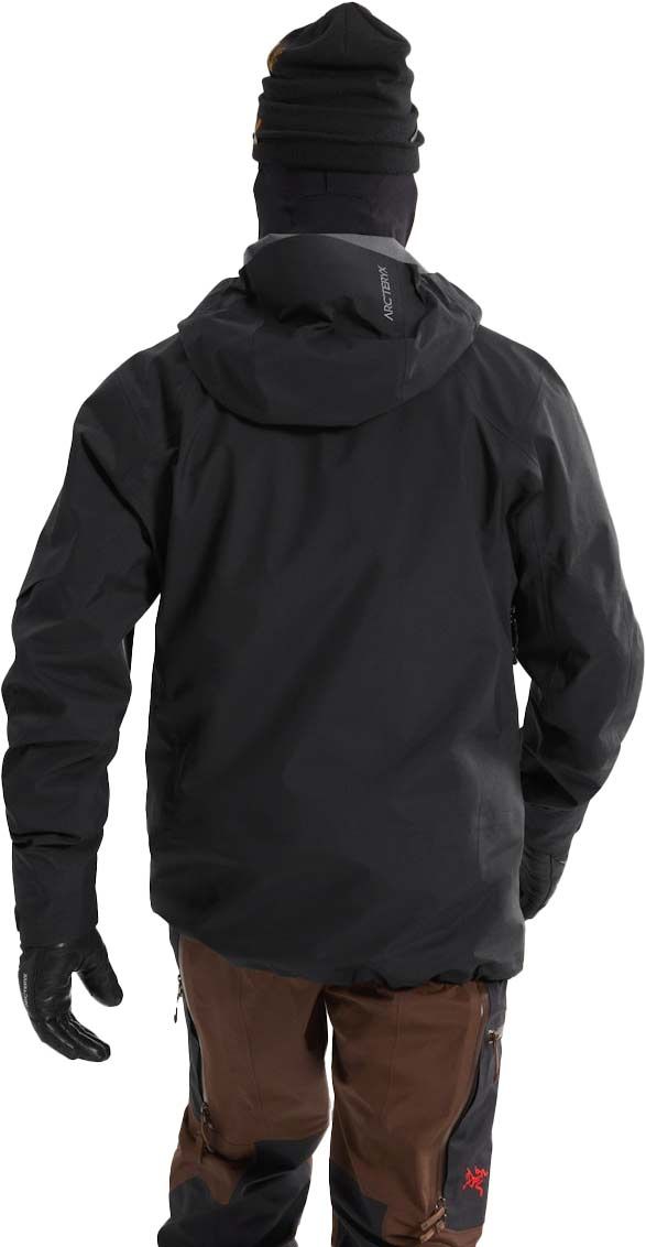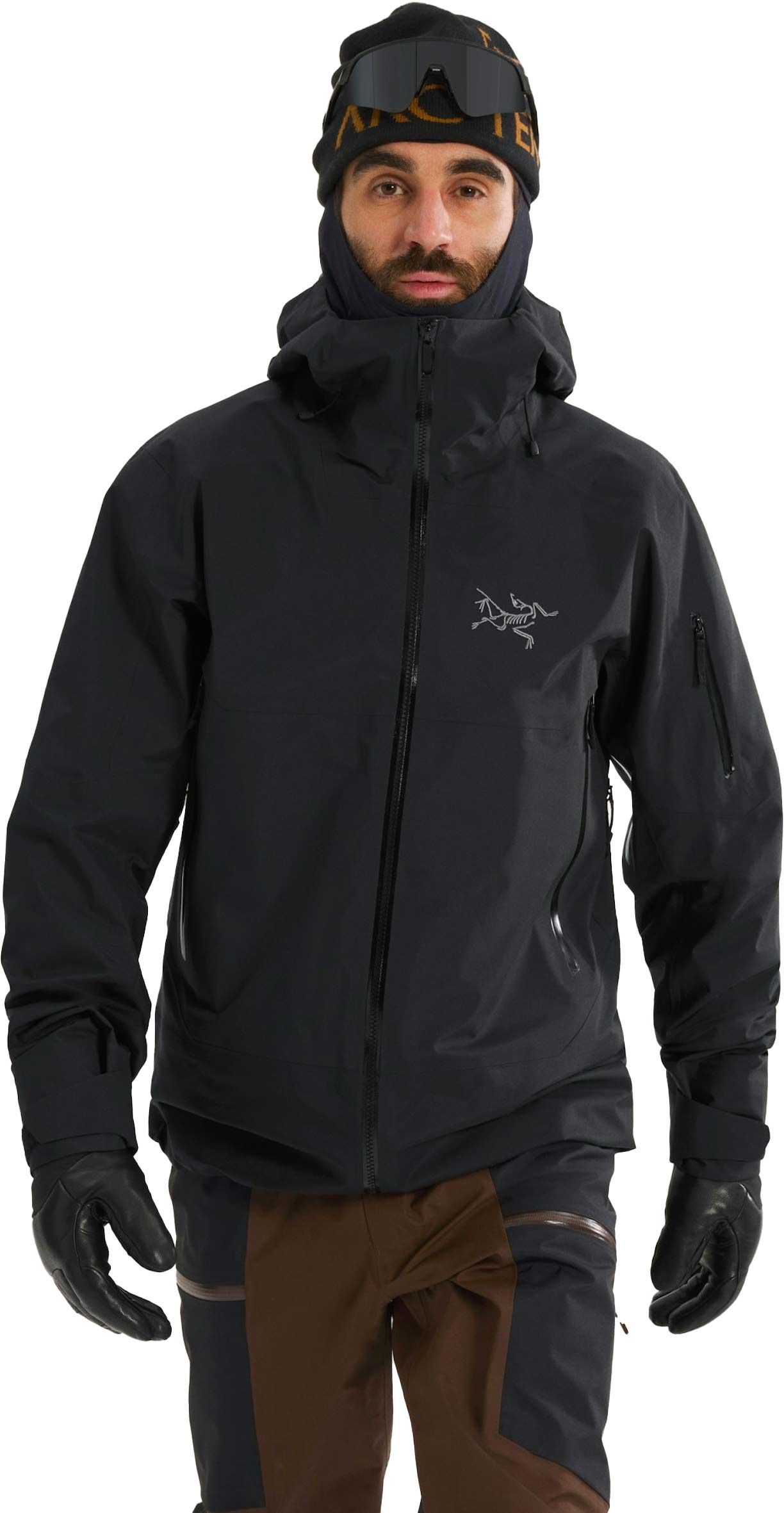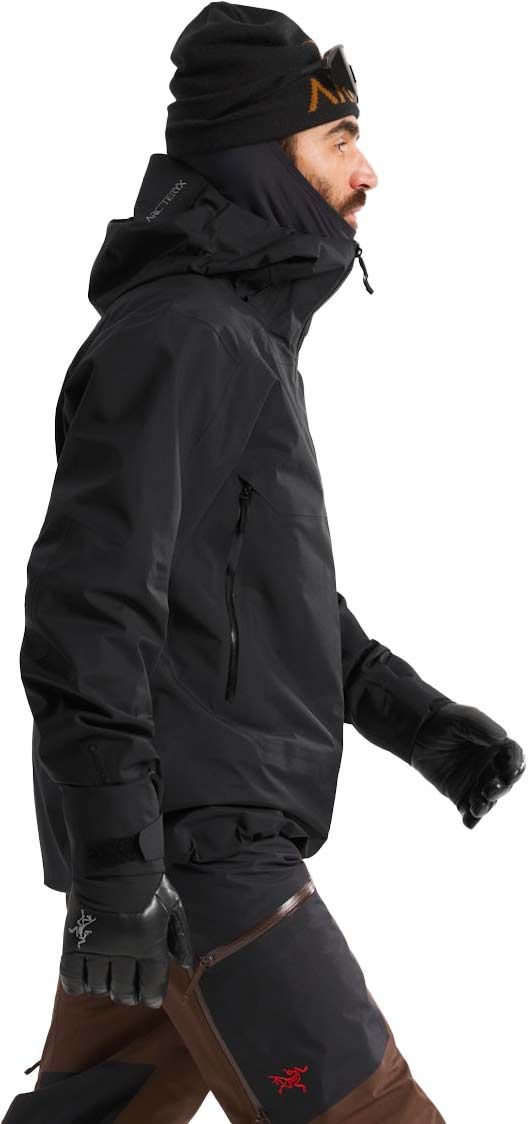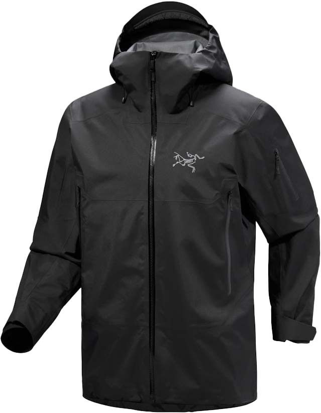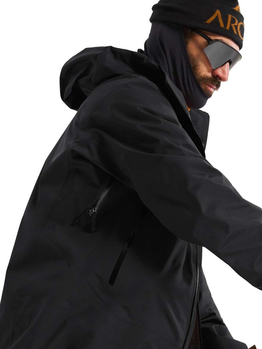 La veste technique Arc’teryx Sabre Jacket Black pour homme combine membrane GORE-TEX epE légère et respirante, capuche StormHood™ compatible casque, guêtre pare-neige et coupe articulée pour freeride hivernal protégé.