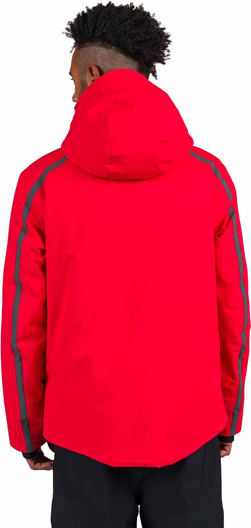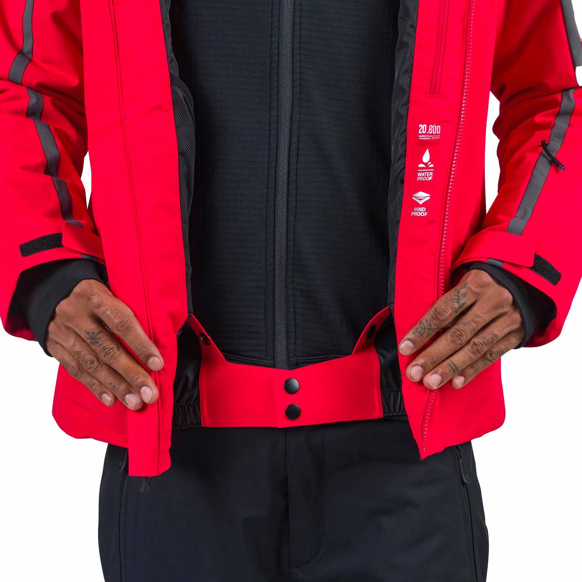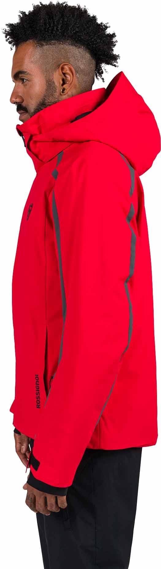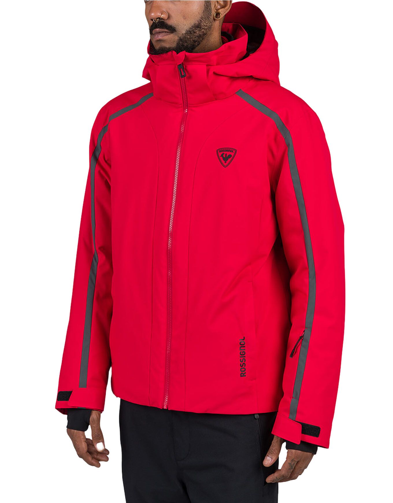 Rossignol Saluver Jkt Sports Red : veste de ski homme isolée en polyester recyclé, membrane imperméable respirante, zips d’aération, capuche casque, jupe pare-neige.