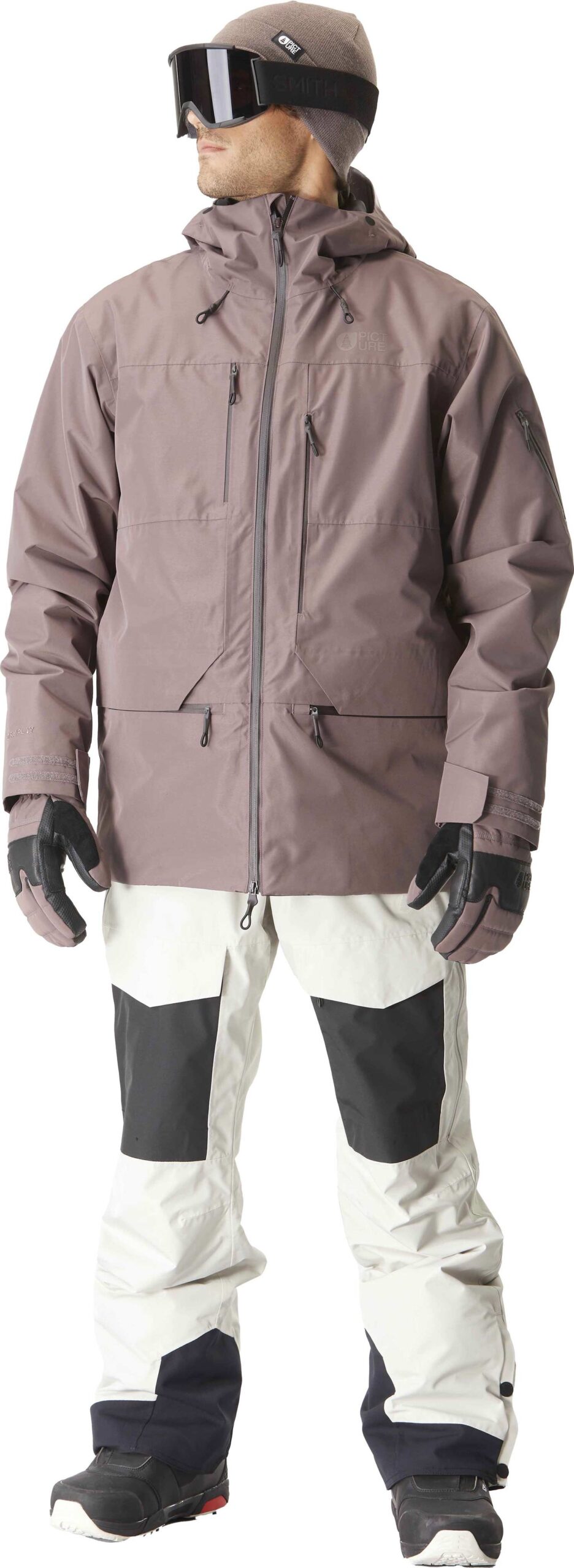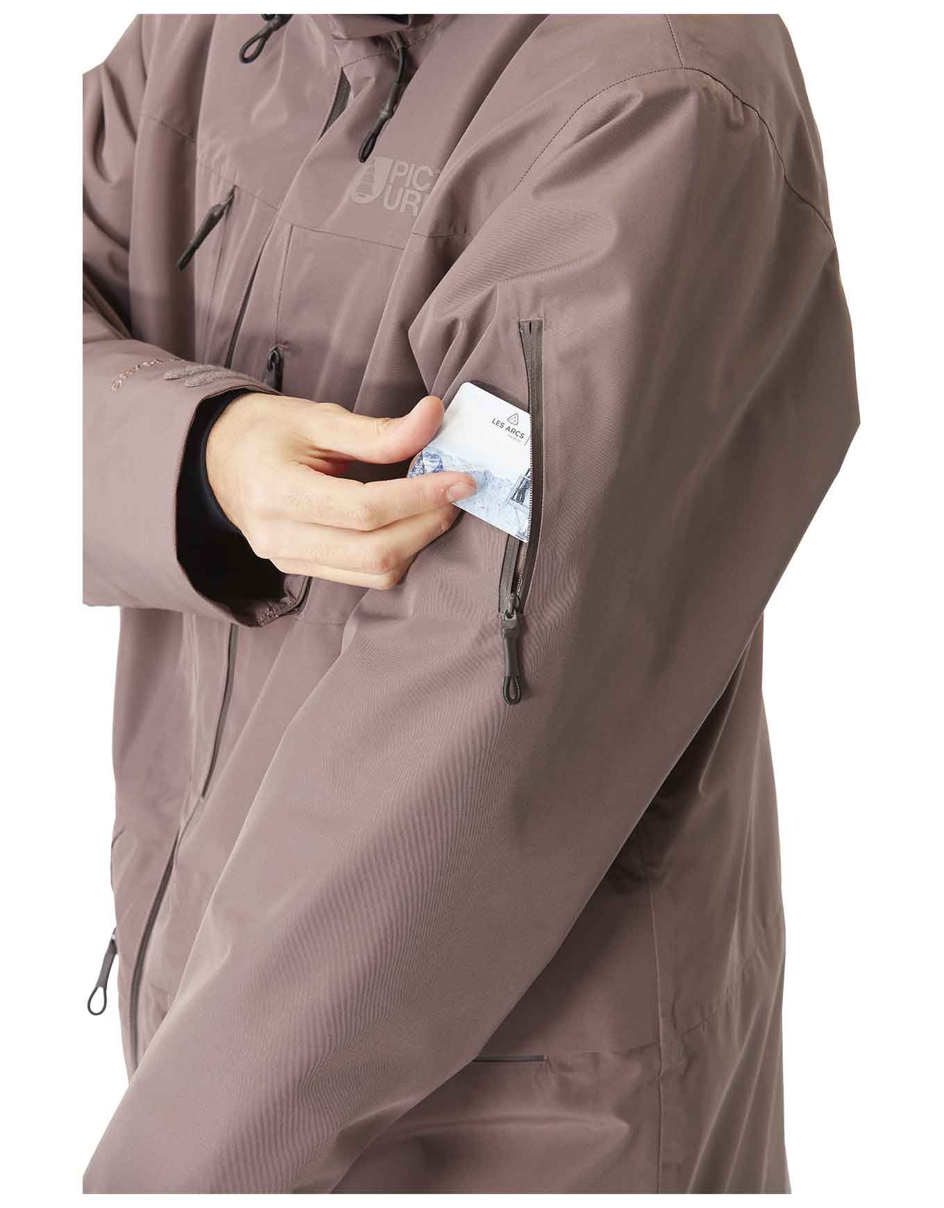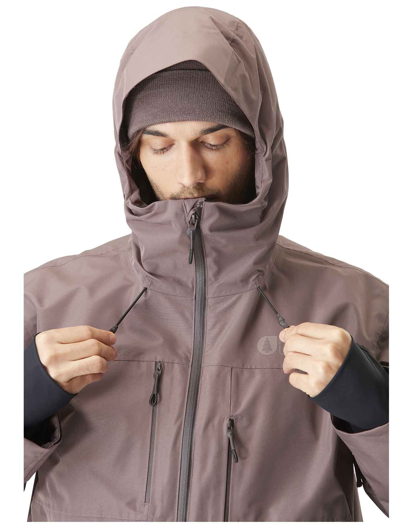 Veste de ski Picture Organic Clothing U55 Plum Truffle, membrane Dryplay 20K/15K, Teflon Ecoelite™ sans PFC, doublure tricot chaude, zips d’aération, capuche et jupe pare-neige amovibles.