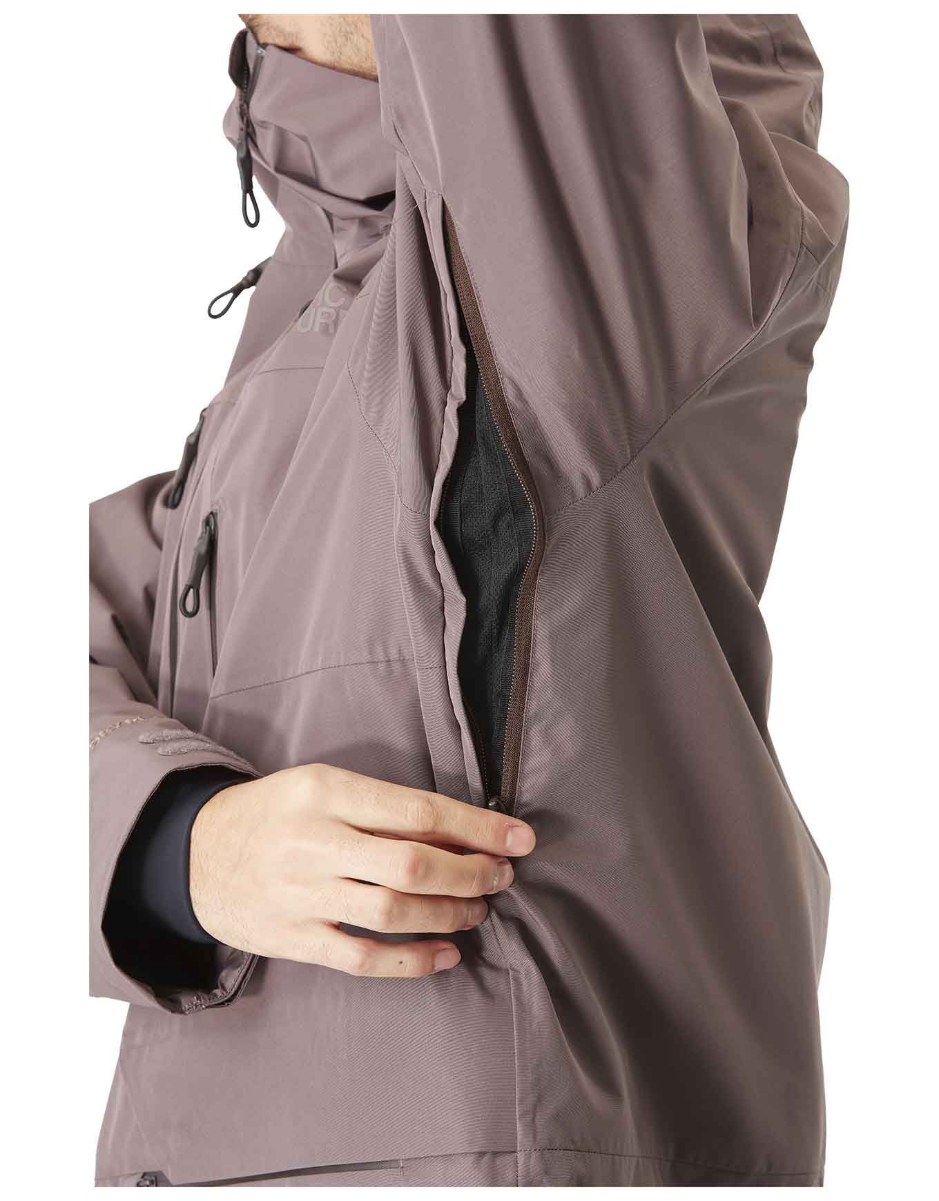 Un complément de chaleur est apporté par une doublure en tricot, alors que la température interne est régulée par des zips de ventilation positionnés sous les bras. Les coutures sont toutes cousues-collées, tandis que l’étanchéité des manchons et des fermetures bloque neige comme eau.