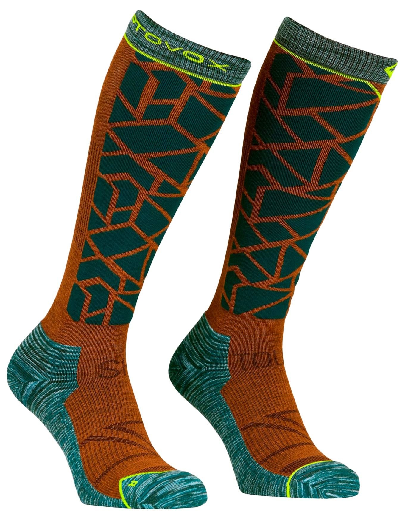 Chaussettes techniques Ortovox Ski Tour Comp Long Socks Dark Pacific, en laine mérinos thermorégulante et anti-odeurs, avec compression uniforme, zones rembourrées talon/orteils et ventilation mollet pour le ski de randonnée et freeride homme.