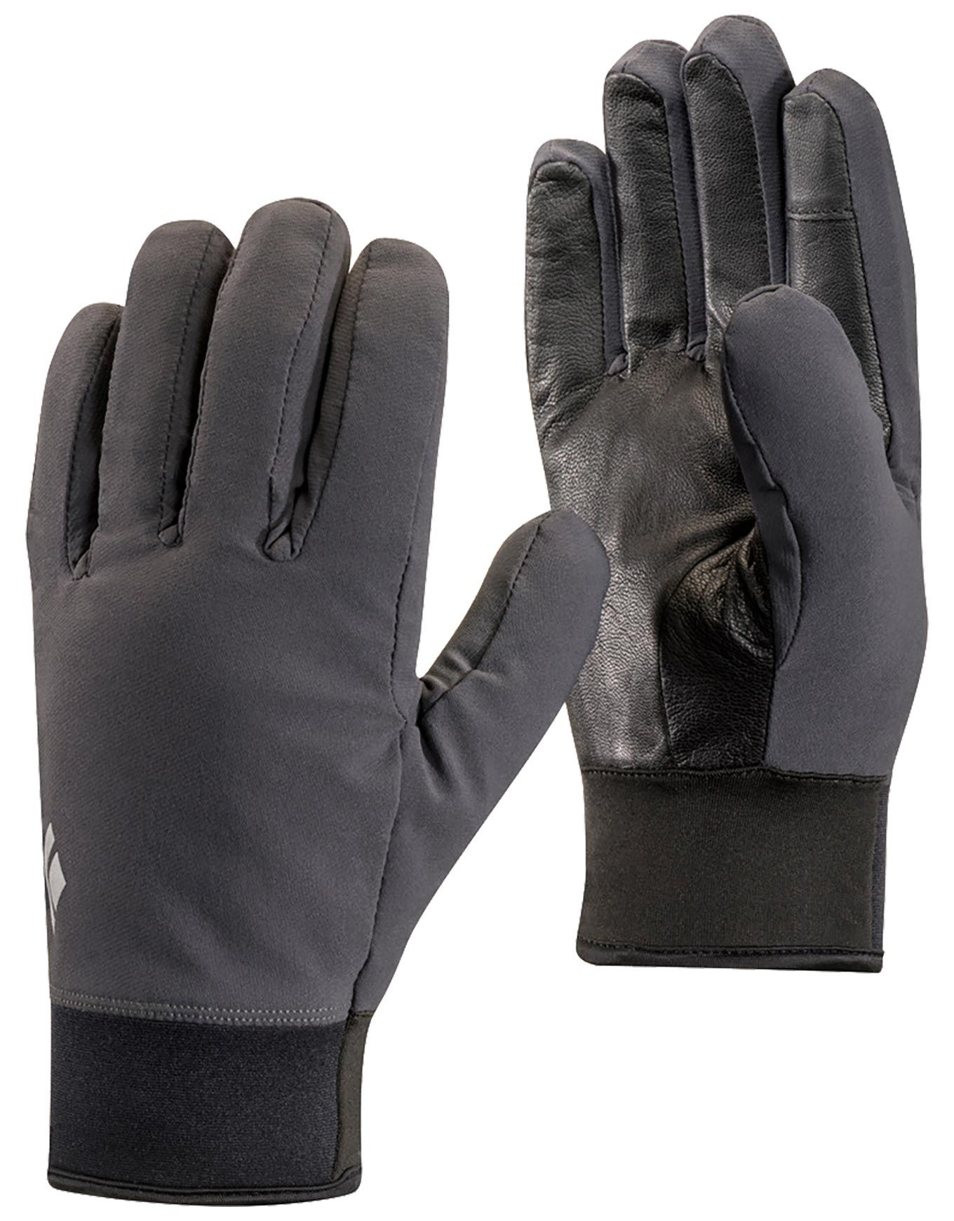 Gants Black Diamond Midweight Softshell Smoke : membrane stretch déperlante, isolation PrimaLoft Gold, paume cuir chèvre, manchettes néoprène polaire pour ski de randonnée et escalade par temps froid.