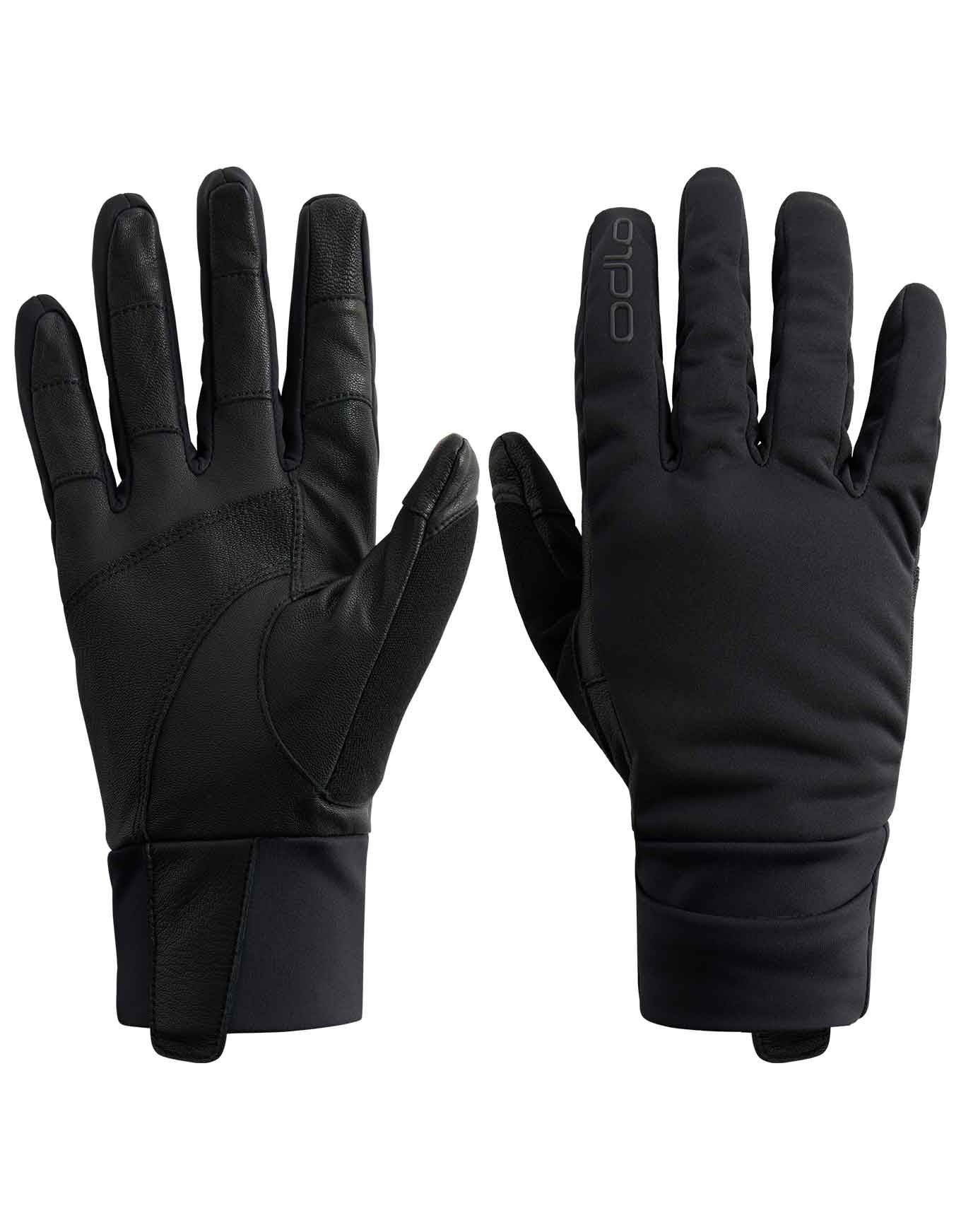 Gants Odlo Gloves Full Finger Nordic Warm : matière softshell coupe-vent, isolation légère, paume cuir de chèvre, compatible écran tactile, fenêtre montre et détails réfléchissants pour le ski de fond.