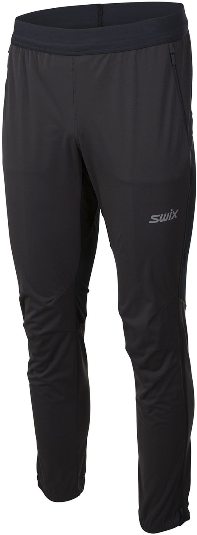 Swix Cross Pant Phantom Black : pantalon softshell coupe-vent et respirant pour ski nordique, avec panneaux extensibles, taille élastique et détails réfléchissants.