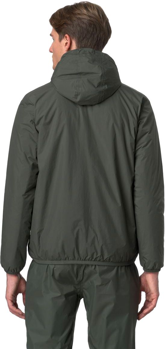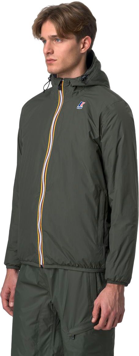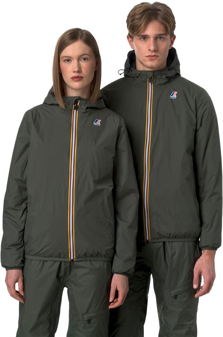 K-Way Le Vrai 4.0 Claude Warm Green Blackish : veste isolée, coupe-vent et imperméable en tissu ripstop respirant, coutures thermocollées, compactable dans une poche, ourlet et poignets élastiqués.